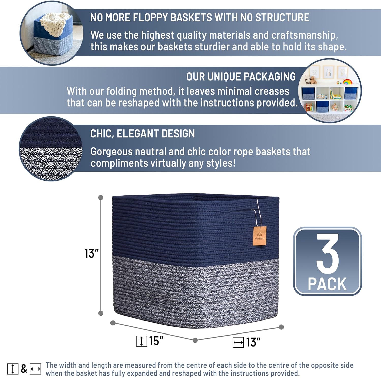 NaturalCozy 13x15x13 Kallax Storage Cubes Bins, 3 Pack | Cotton Rope Cube Storage Bin Woven Baskets for Organizing | Kallax Insert Storage Baskets for Shelves Organizer, Kids Toy, Closet Baby Nursery