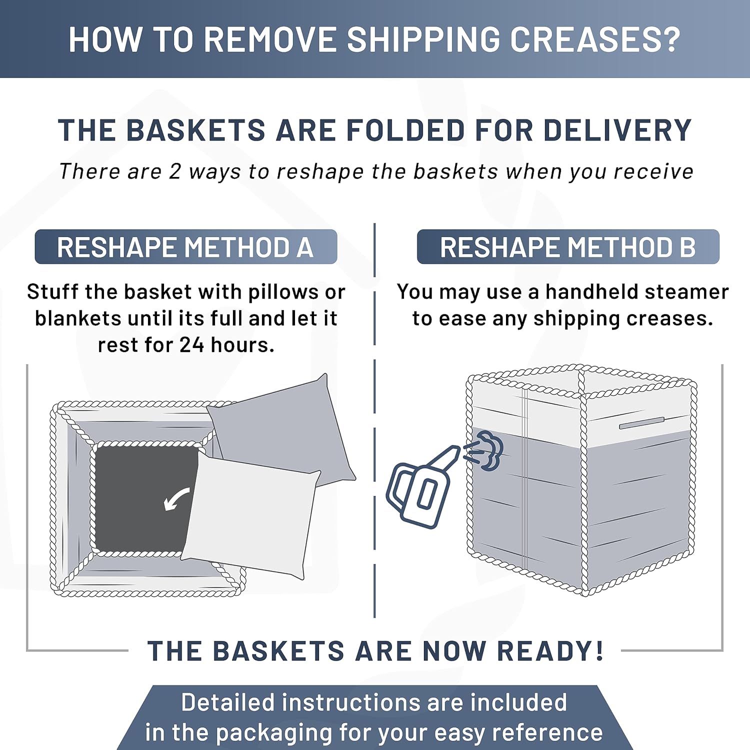 - No More Wrinkly Floppy Woven Baskets: Prepare to have your socks knocked off (and then neatly organized), when you take a peek at our woven rope basket set. No more ‘permanently’ creased up, floppy storage basket here. Thanks to our unique folding method and quality rope, shaping is easy with the instructions provided!