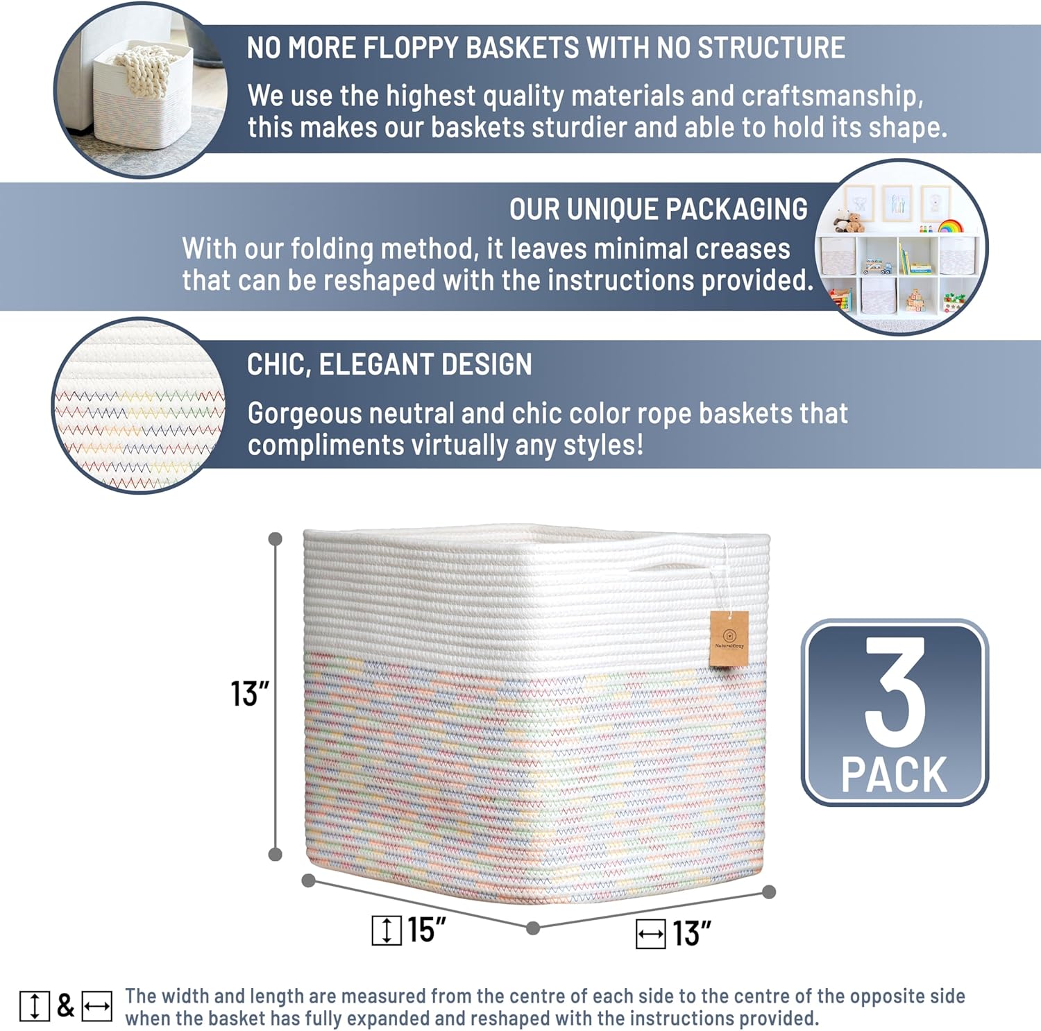 NaturalCozy 13x15x13 Kallax Storage Cubes Bins, 3 Pack | Cotton Rope Cube Storage Bin Woven Baskets for Organizing | Kallax Insert Storage Baskets for Shelves Organizer, Kids Toy, Closet Baby Nursery