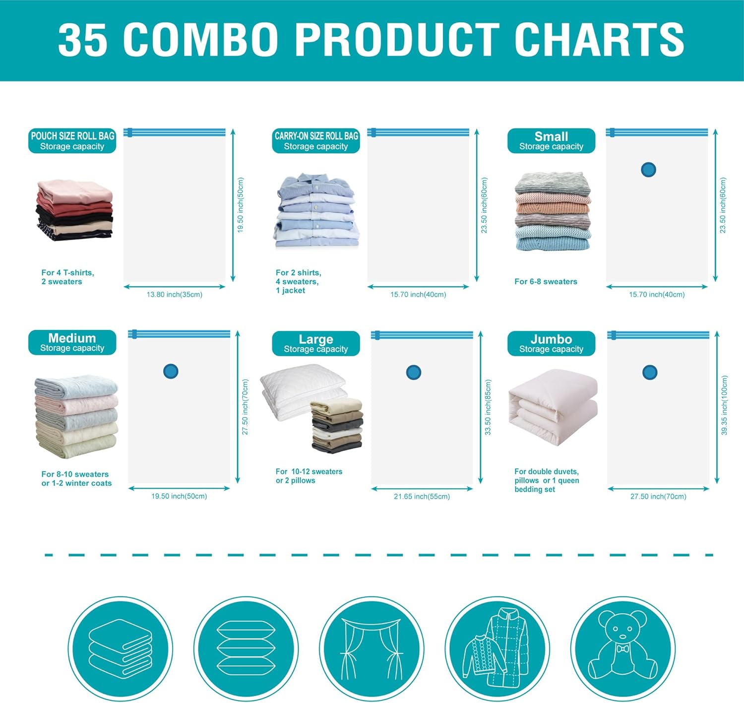 - 35 PACK INCLUDES: 5 Jumbo: 39.35” X 27.5”(100cm X 70cm); 6 Large: 33.5” X 21.65”(85cm X 55cm); 6 Medium: 27.5”X 19.5”(70cm X 50cm); 6 Small: 23.5”X 15.7” (60cm X 40cm); 6 Travel Roll Up (No need vacuum holes): 23.5”X 15.7” (60cm X 40cm);6 Pouch Sized Travel Roll Up (No need vacuum holes)