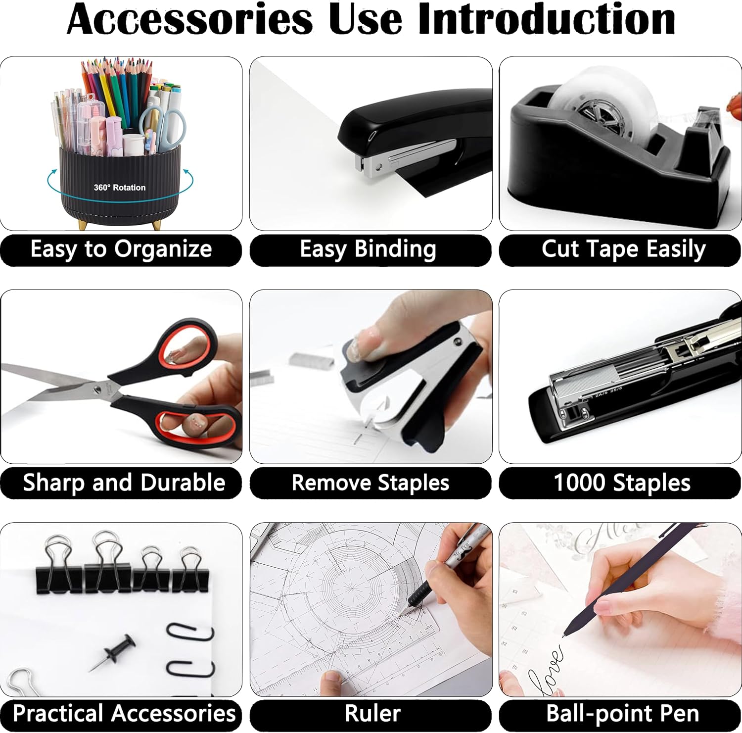 Office Desk Accessories, Black Office Supplies 360°Pen Holder Desk Organizers And Accessories with Tape Dispenser, Stapler, Staple Remover, 1000 Staples, Tape, Clips Set, Ruler, Scissor, Pen