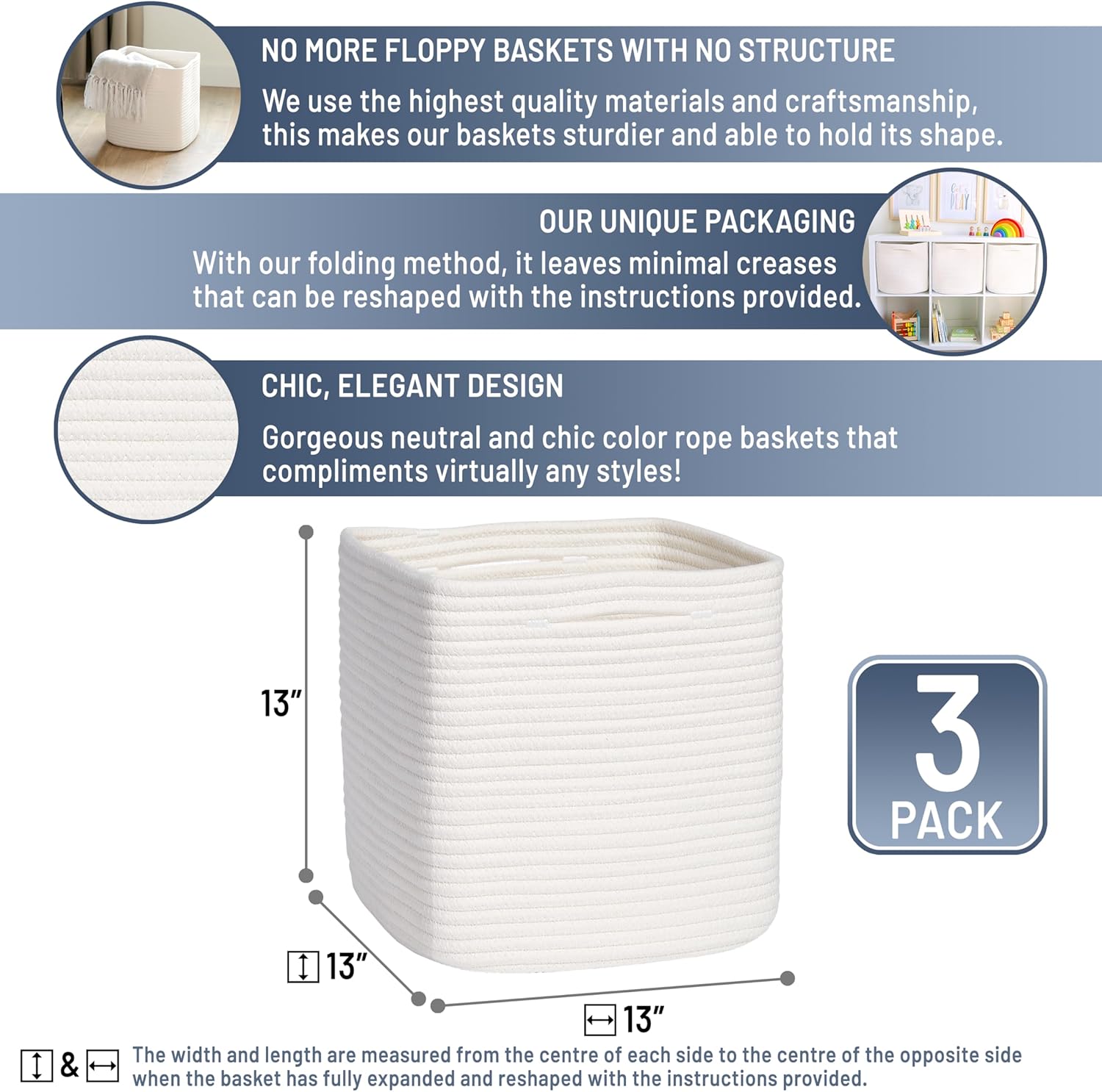 - No More Wrinkly Floppy Woven Baskets: Prepare to have your socks knocked off (and then neatly organized), when you take a peek at our woven rope basket set. No more ‘permanently’ creased up, floppy storage basket here. Thanks to our unique folding method and quality rope, shaping is easy with the instructions provided!