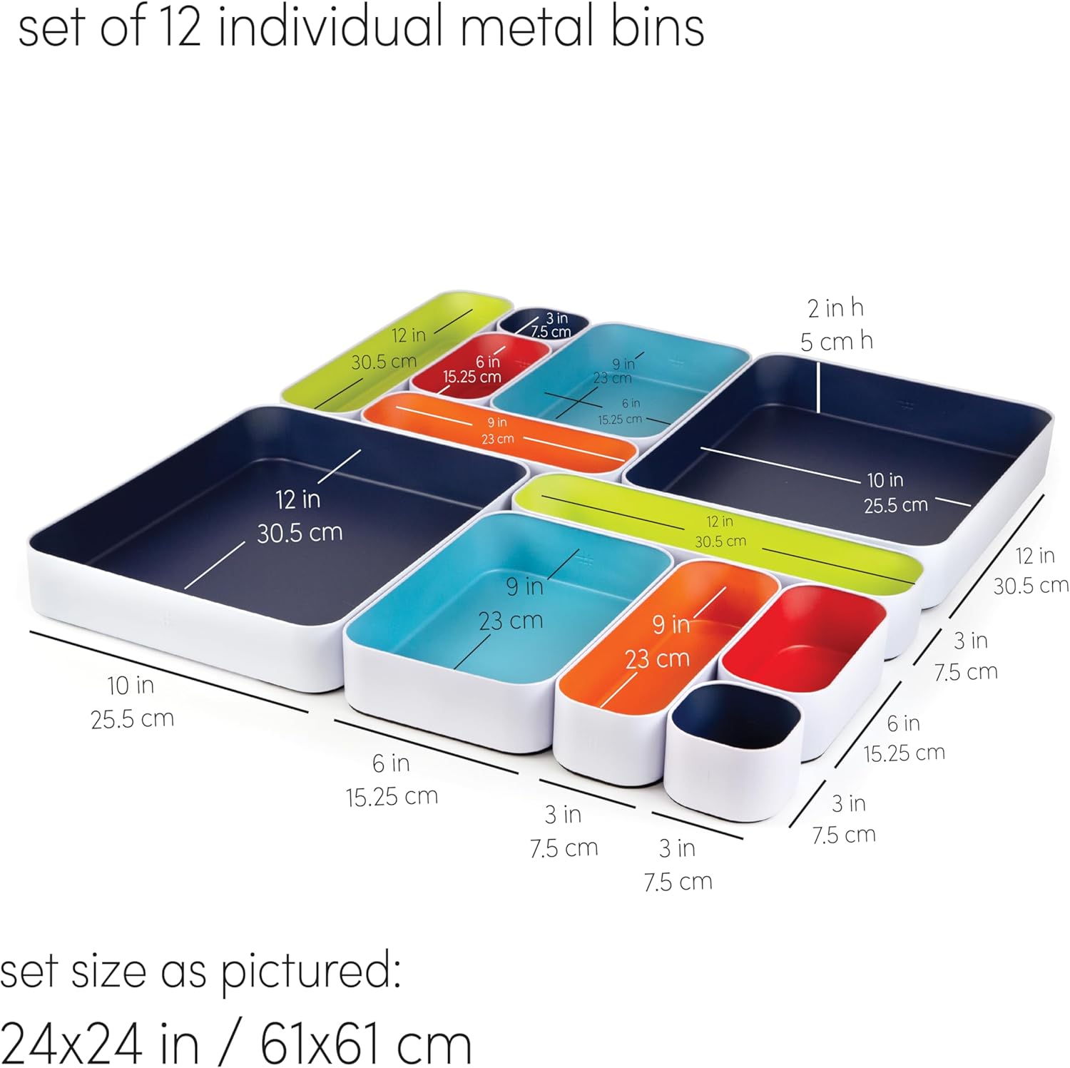 Three by Three Seattle 12 Piece Metal Organizer Tray Set for Storing Makeup, Stationery, Utensils, and More in Office Desk, Kitchen and Bathroom Drawers (Classic Colors)