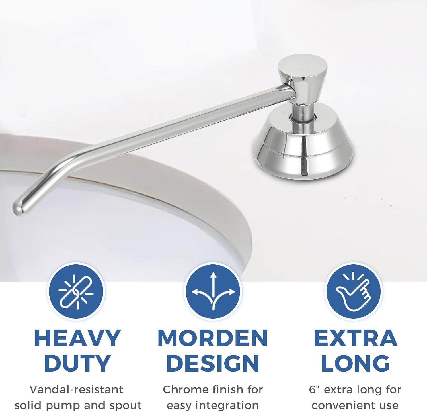 Heavy Duty Brass Countertop Liquid Soap Dispenser, Commercial Grade Top Fill Built-in Soap Dispenser with 34 oz/ 1L Bottle for Bathroom, Kitchen, Public Restroom, Chrome Finish, 6” Spout