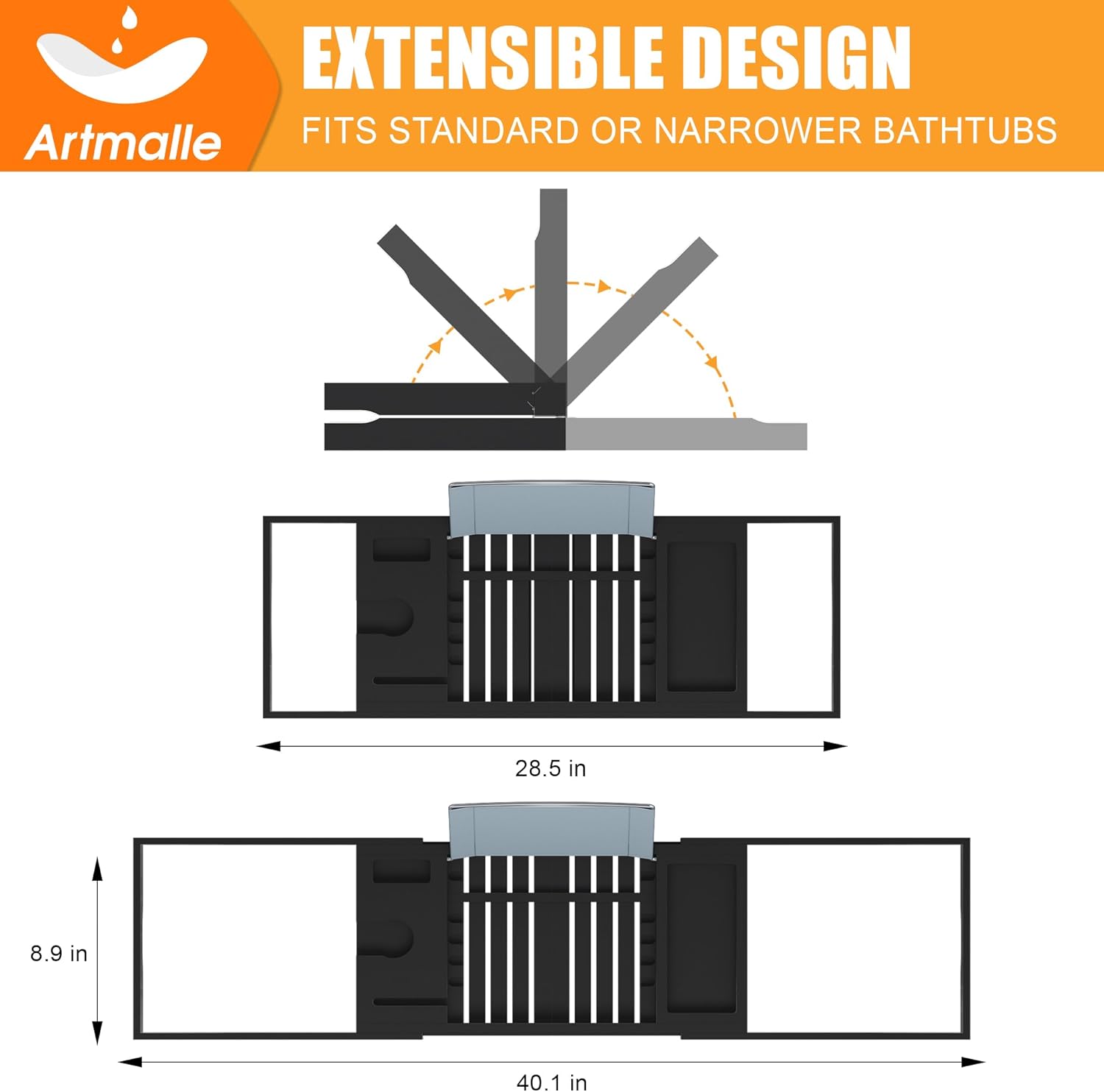 Luxury Bathtub Caddy Tray for Tub - Foldable Bamboo Bath Table Tray with Book and Wine Glass Holder, Expandable Bathroom Accessories for Spa or Reading Lite Style,Black