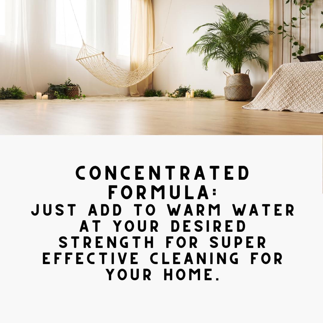 - EFFORTLESS APPLICATION: Simply dilute with water and apply to your mop for effortless, effective cleaning without the need for harsh chemicals, simplifying your cleaning routine. You can also add 4 tbsp into a 16 oz spray bottle of water as it dubles as an odoe eleininating all purpose cleaner. Up to 16 uses per container.