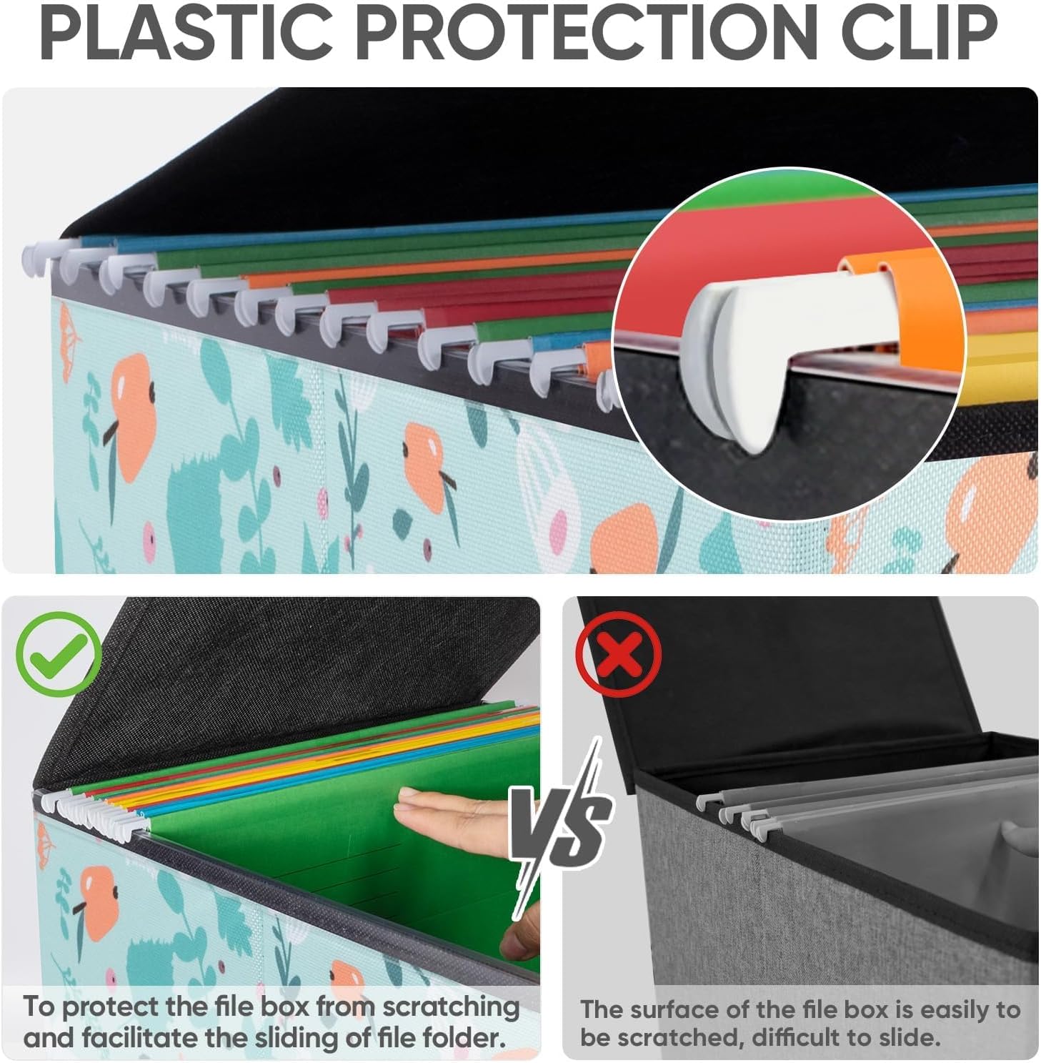 - [UNIVERSAL SIZE] Our file box with lid fits letter-sized files. It is designed for efficiency and functionality, with its smooth PVC slide rails on both sides, you can effortlessly slide file folders for easy access and neatly arranged. The lid fits snugly on the box after hanging folders. (NOTE: file folders are not included)