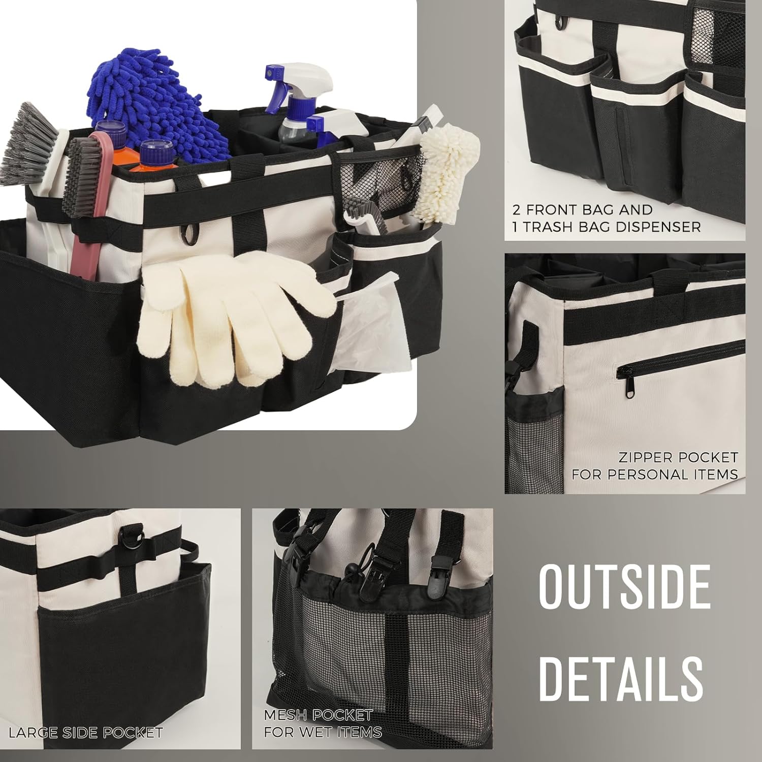 - Exquisite Details: The 5 inner compartments are large enough for organizing cleaning tools. 3 individual deep outer pockets, 1 mesh side pocket and 1 trash bag dispenser allow you storage and access of other cleaning tools. Also, securely zipped pocket is design for safely storing your important items