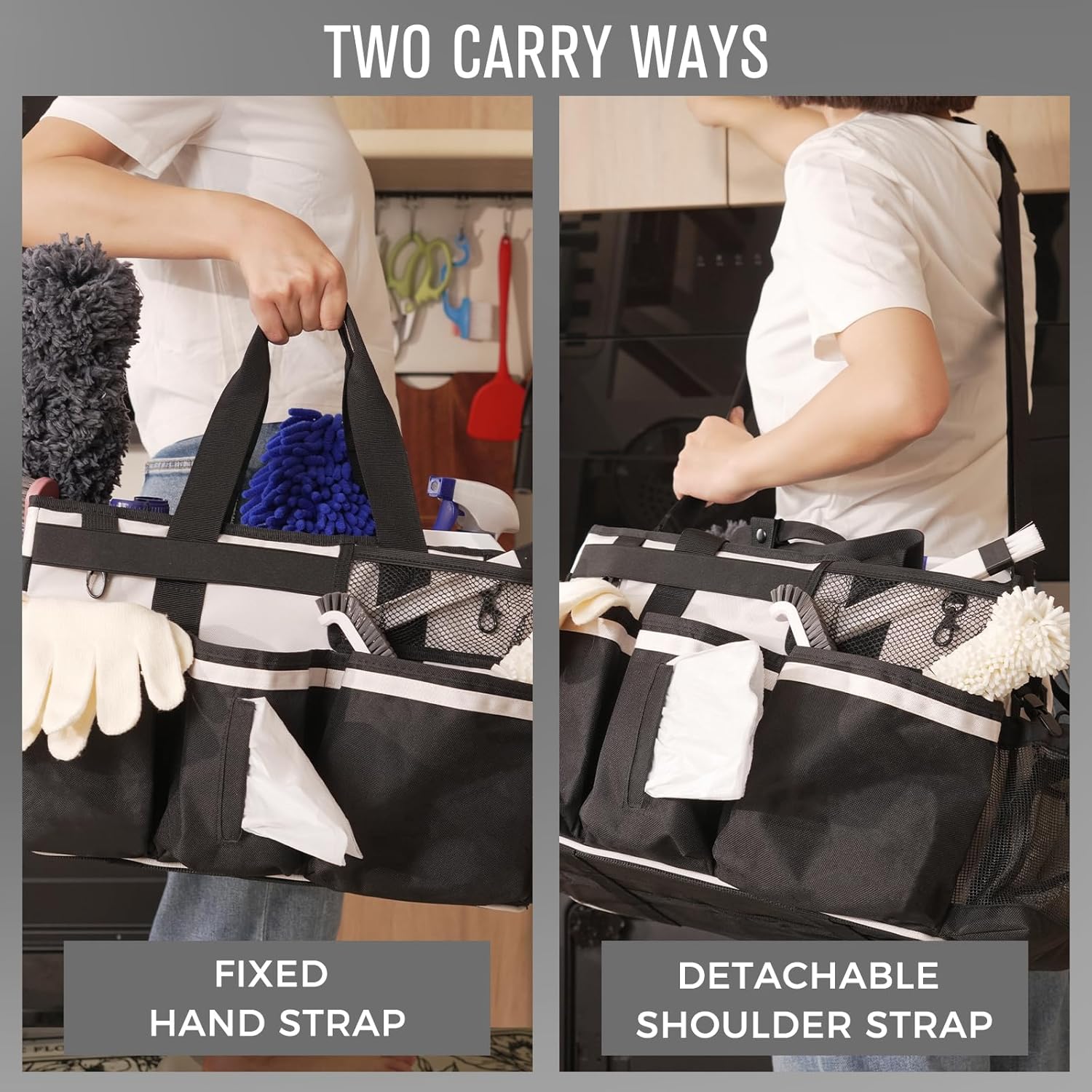 - Large Wearable Cleaning Caddy: Our cleaning organizer bag is perfect for storing cleaning supplies & tools, measures 15.7 x 9.6 x 9.1 inches. Cleaning caddy bag with handle and adjustable shoulder straps for easily cleaning in the home, kitchen, sink, car, and outside. Keep your cleaning items well-organized and neatly. Great for maids and housekeepers