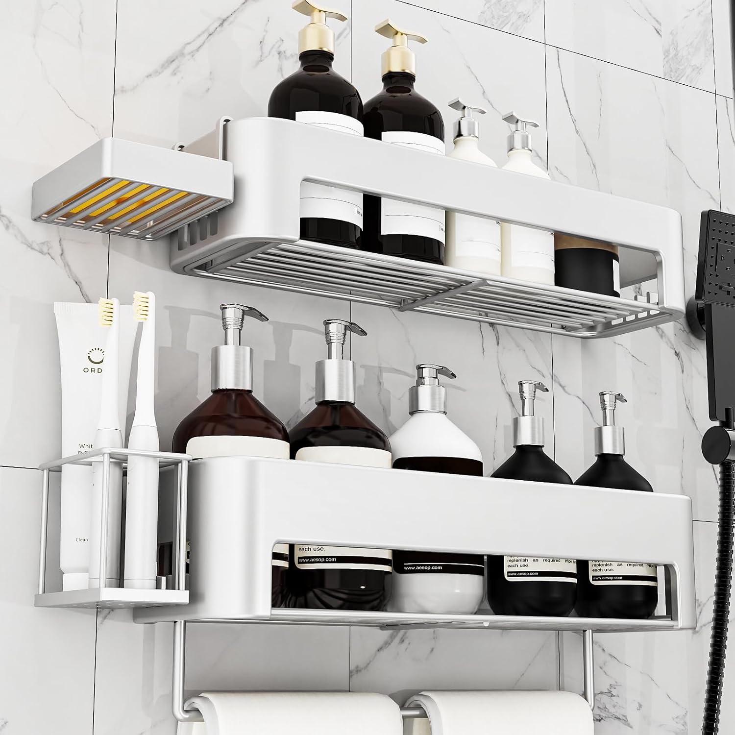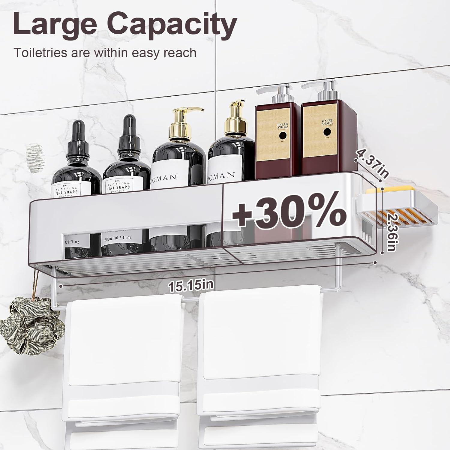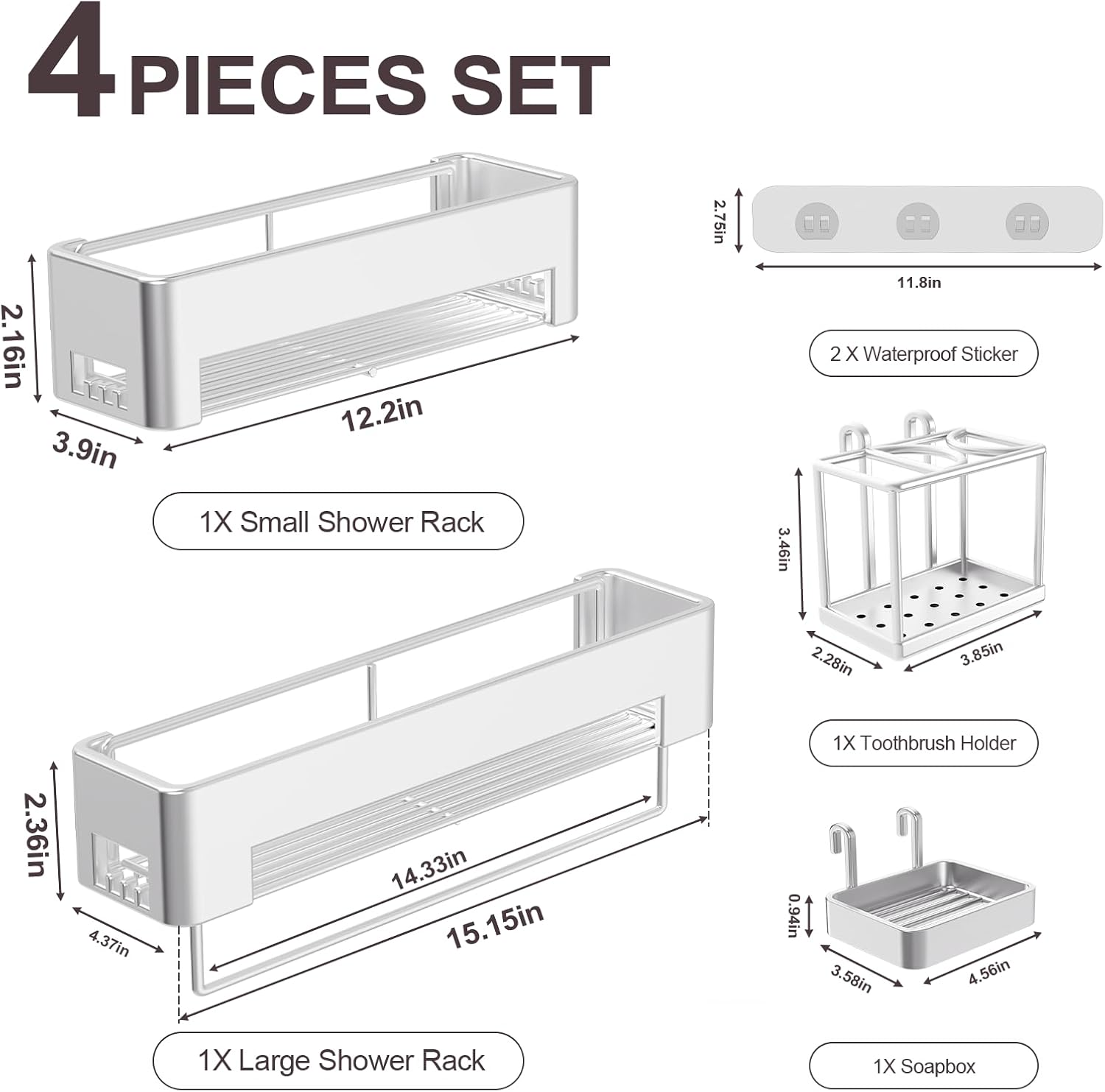 - Multi-functional Design: 4-Piece set shower caddy includes two shower organizers (12.2'' & 15.15'') + a hangable soap holder +a toothbrush holder, comes with a towel rack and 12 hooks.Shower shelf provides 30% more capacity than similar products on the market.
