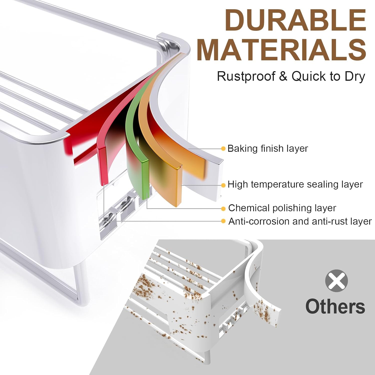 - Premiun Quality Rust and Waterproof Construction: Shower shelves for inside shower made of smooth rust and thickened waterproof coating to ensure long term durability even in wet environments. Scratch-resistant surface with cut-out bottom is easy to clean, just rinse and air dry.