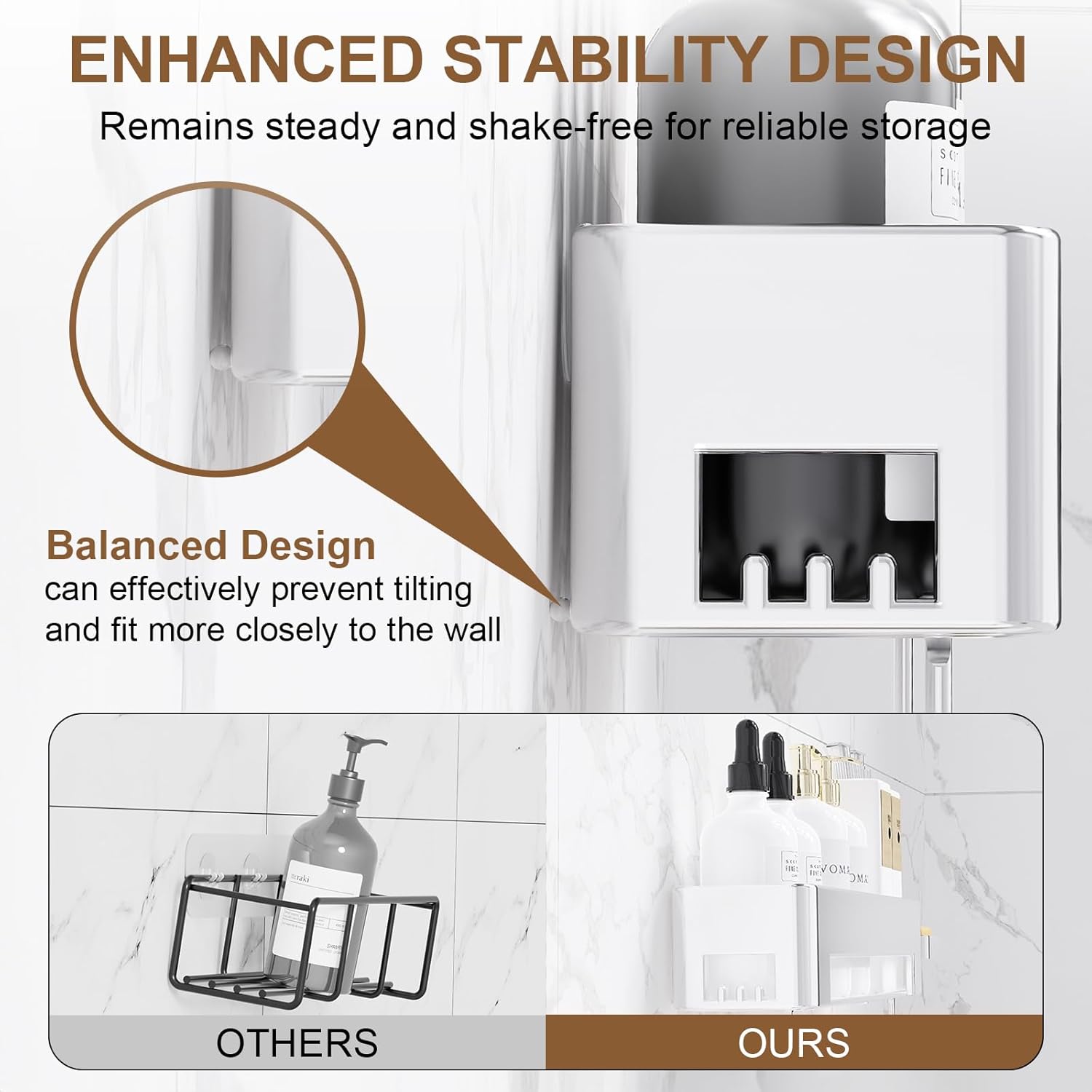 - Scientifically Balanced Design: The shower rack adds an anti-tilt +the heightened edges design to prevent bottles from dumping or falling, making the bathroom shower organizer fit the wall better, ensuring safe use.