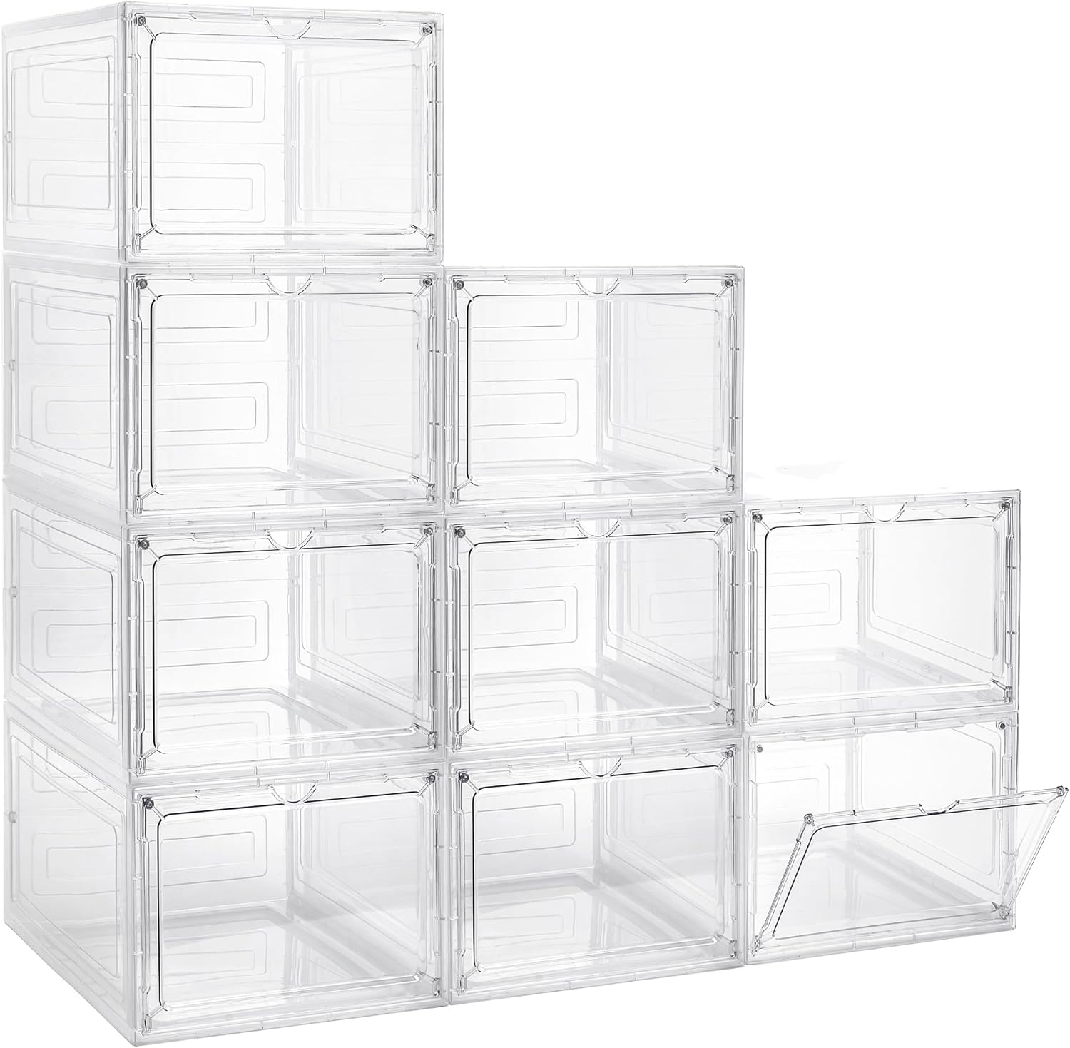 - See Through Design & Specifications: Size 10.65" x 13.54" x 7.52", 3 pcs. Stackable storage bins look very clean and stylish. PP material except acrylic door, not fully transparent