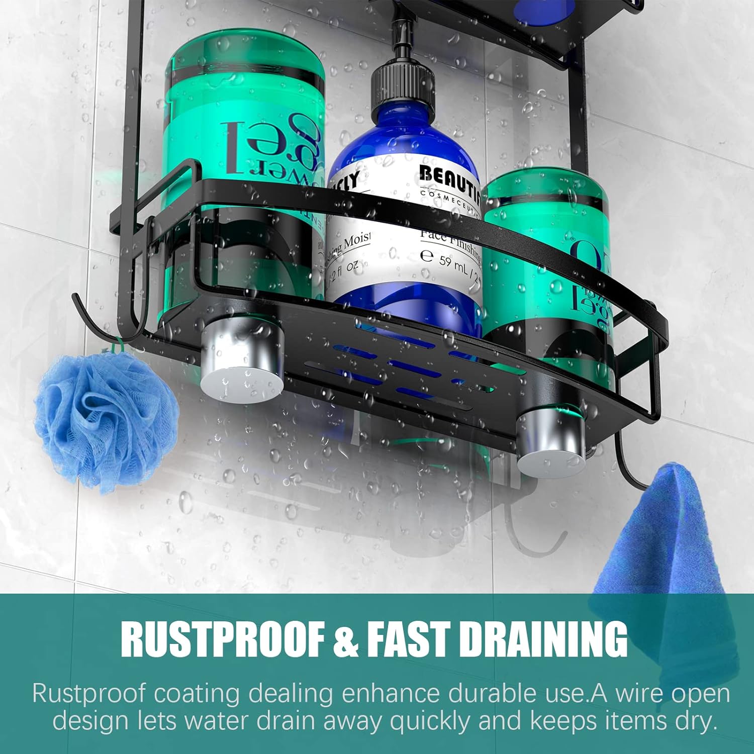 - 🛀FULL FUNCTION SHOWER CADDY: Our hanging shower caddy with tiered design and strong load-bearing capacity, ideal for organizing bath accessories like shampoo, conditioner, body wash, soap. 4 removable hooks to conveniently hang razor, shower sponge, washcloth and more.