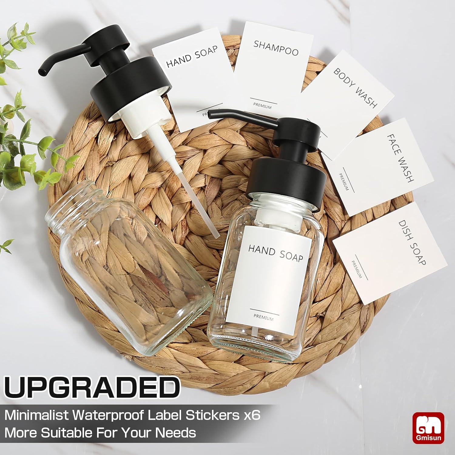 GMISUN Foam Soap Dispenser, 2 Pack 8.5 fl oz / 250 ml Clear Glass Soap Dispenser for Bathroom & Kitchen, Modern Hand Soap Dispensers, Refillable Glass Foaming Soap Dispensers with Waterproof Labels