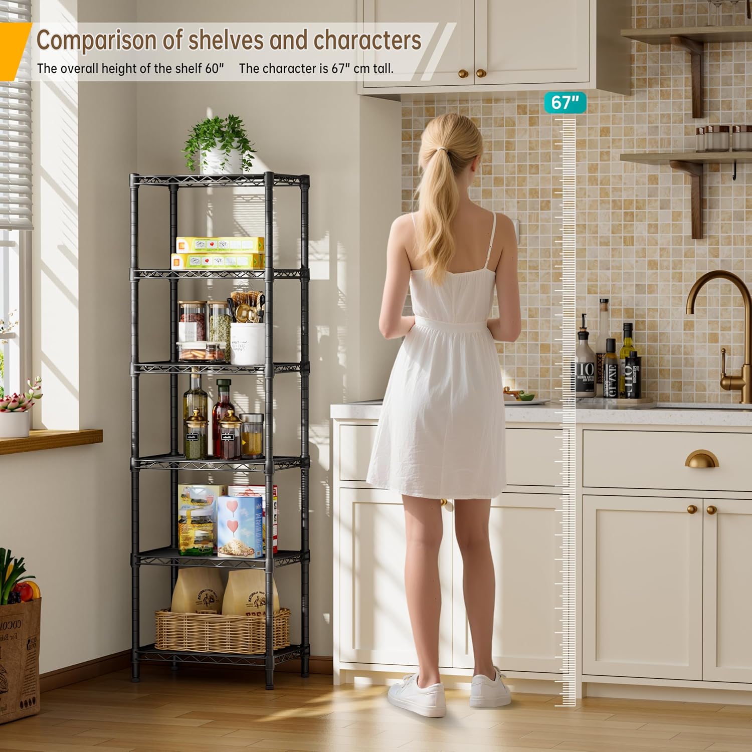 6 Tier Shelf Adjustable Storage Mesh Gaps Metal Utility Shelves Wire Shelving Unit Organizer Rack for Home Kitchen Office Bathroom Pantry Room10 D x 16" W x 60" H Black