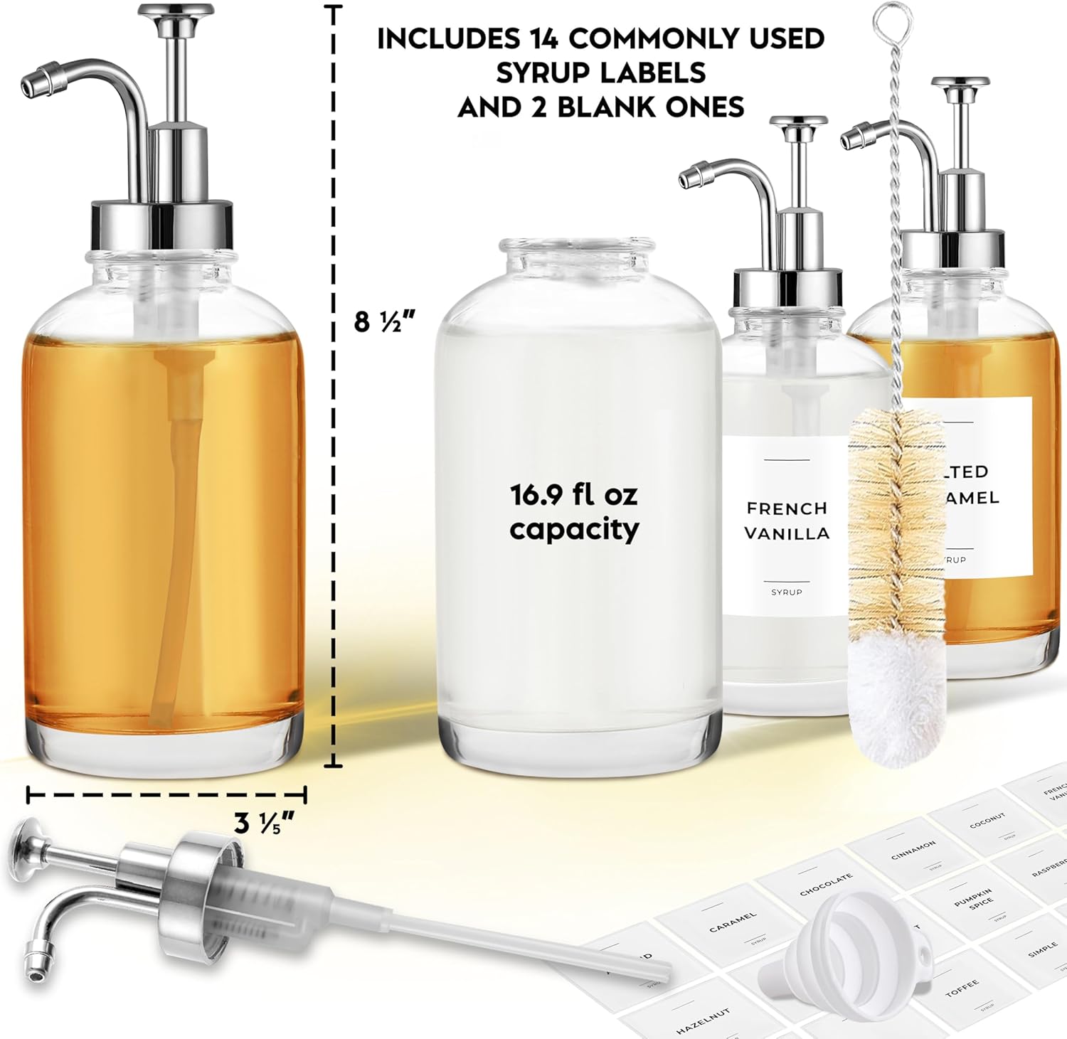 - All-in-One Value Pack for Coffee Lovers — This set of 4 glass syrup bottles includes 24 waterproof syrup labels, a cleaning brush, and a silicone funnel for effortless refills. Perfect for keeping multiple flavored syrups organized, it’s a cost-effective upgrade to your coffee station.