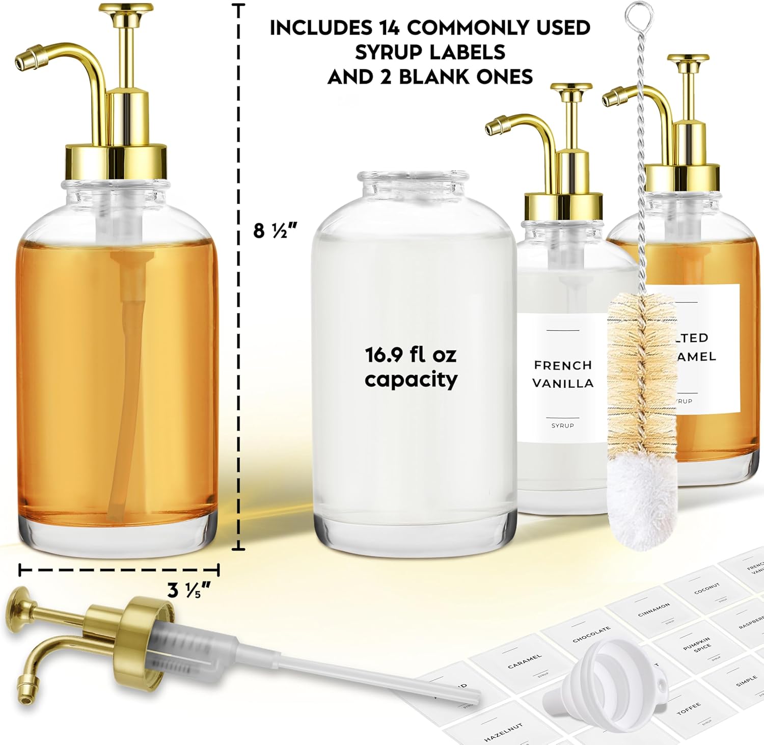 - All-in-One Value Pack for Coffee Lovers — This set of 4 glass syrup bottles includes 24 waterproof syrup labels, a cleaning brush, and a silicone funnel for effortless refills. Perfect for keeping multiple flavored syrups organized, it’s a cost-effective upgrade to your coffee station.