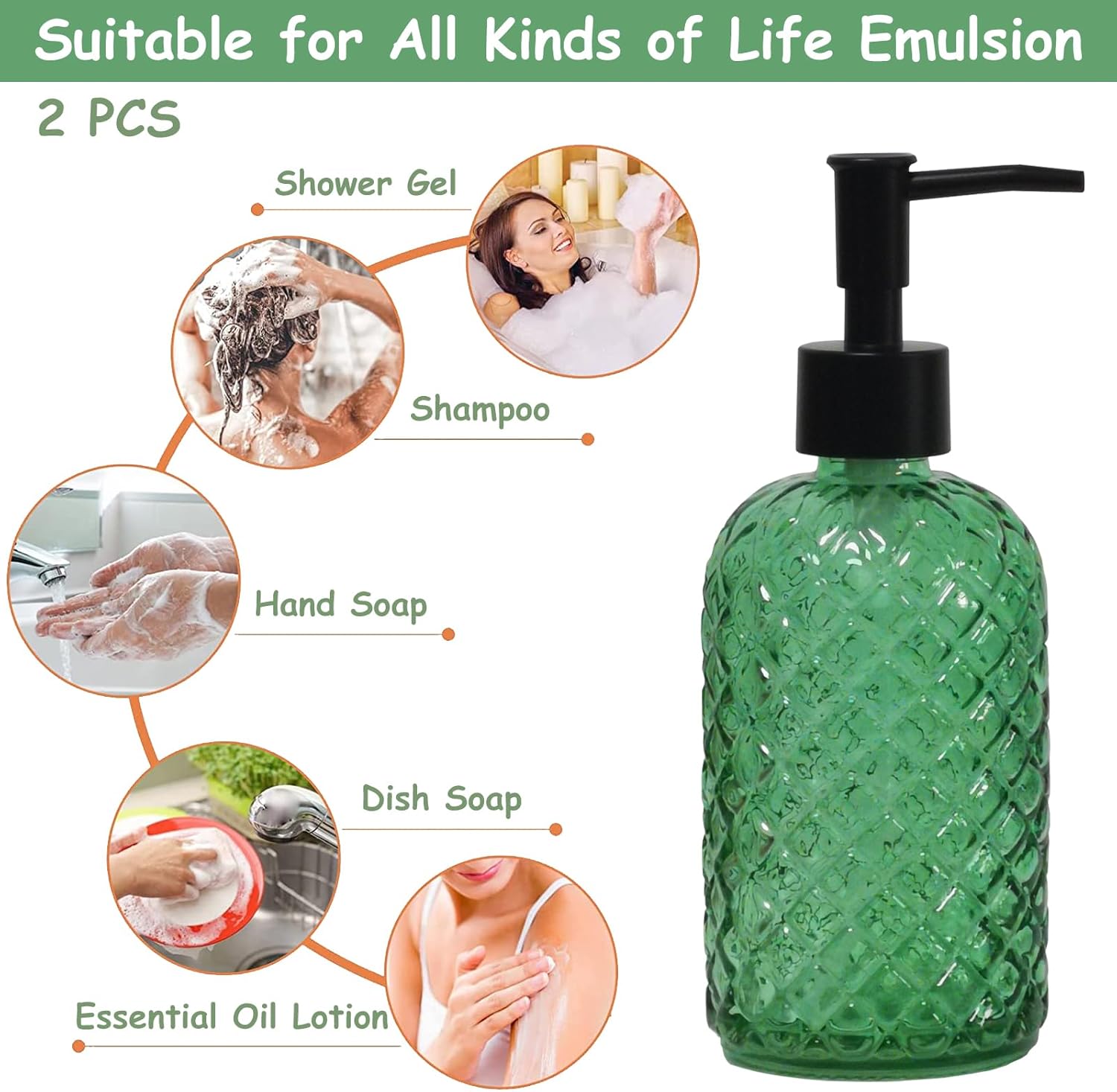 Green Glass Soap Dispenser with Black Pump, 13.5oz Liquid Hand Soap Dispenser Set, Dish Soap Lotion Dispenser for Modern Home Decor, Bathroom, Kitchen Countertop, Hotel(2 Pack)
