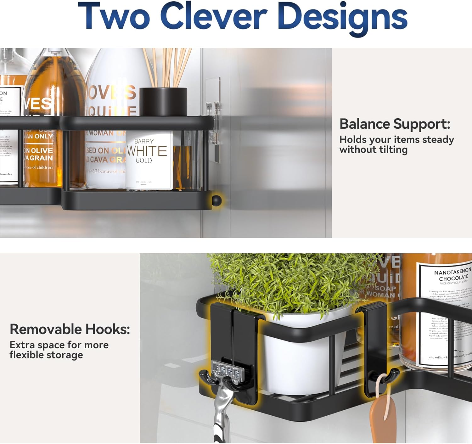 - 5-in-1 Shower Rack Set:Upgraded L-shaped corner shower shelves maximizes unused 90° wall space with 30% larger capacity than standard models. Holds 19+ full-size shampoo bottles (40lbs) - perfect for bathroom essentials, kitchen spices, or RV storage