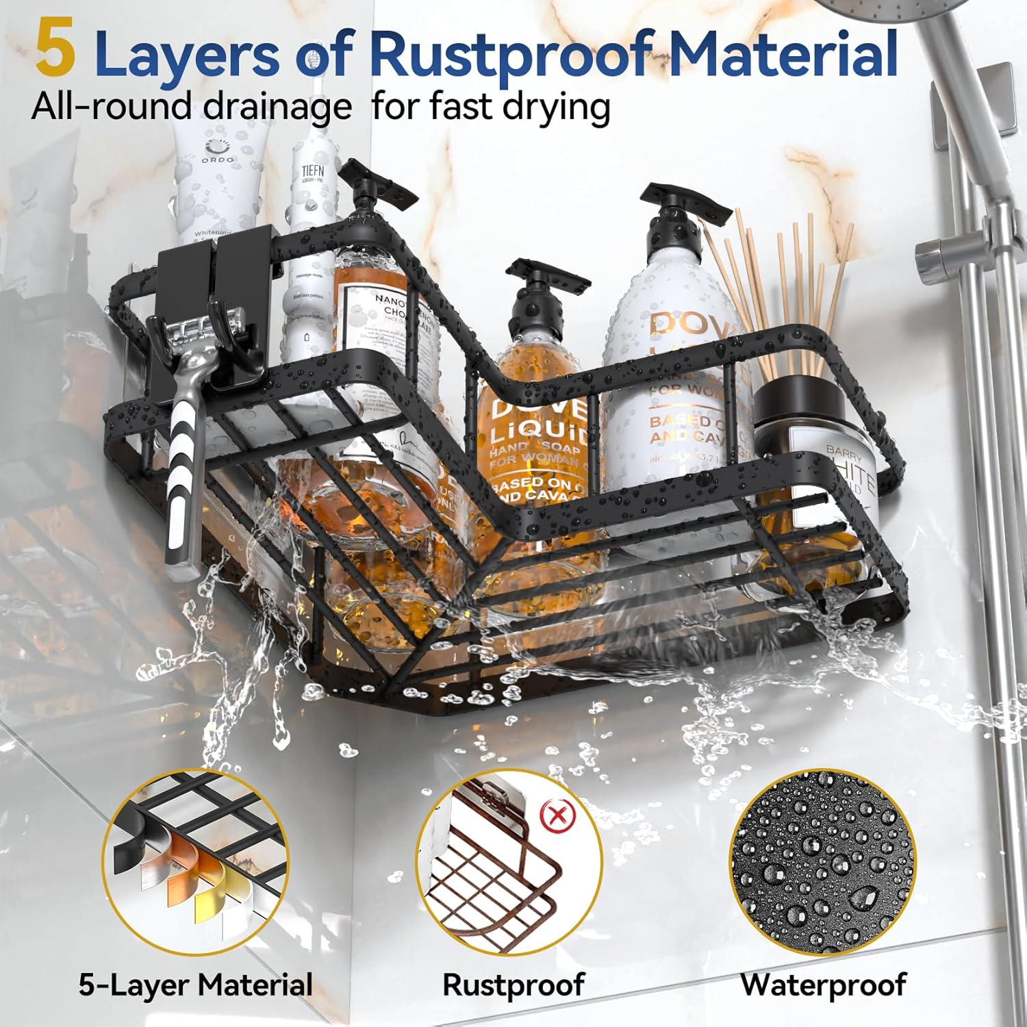 - High-Quality Materials:Constructed with heavy-duty stainless steel, this shower storage features rust-proof coating and hollow drainage design. Water cascades through tiered shelves, keeping toiletries dry. Wipe clean with one swipe