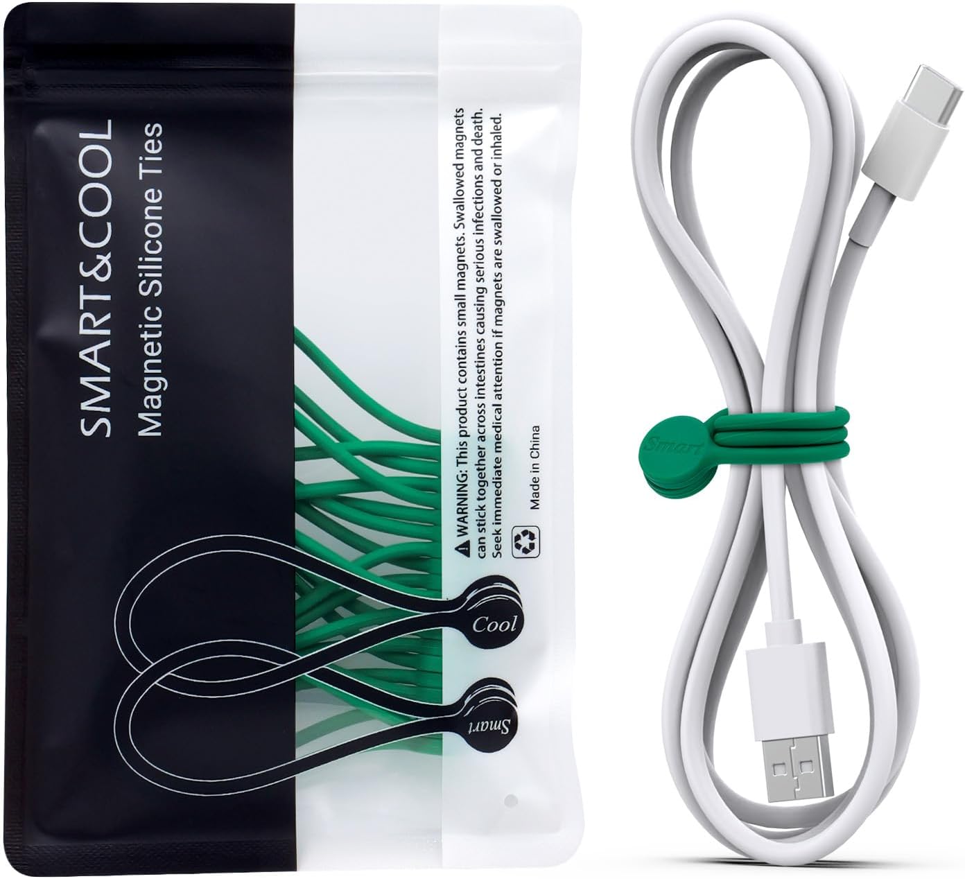 SMART&COOL Reusable Silicone Magnetic Cable Ties for Bundling and Organizing, Holding Stuff, Book Markers, Fridge Magnets, Assorted Color, 7.16'' (10-Pack, Green)