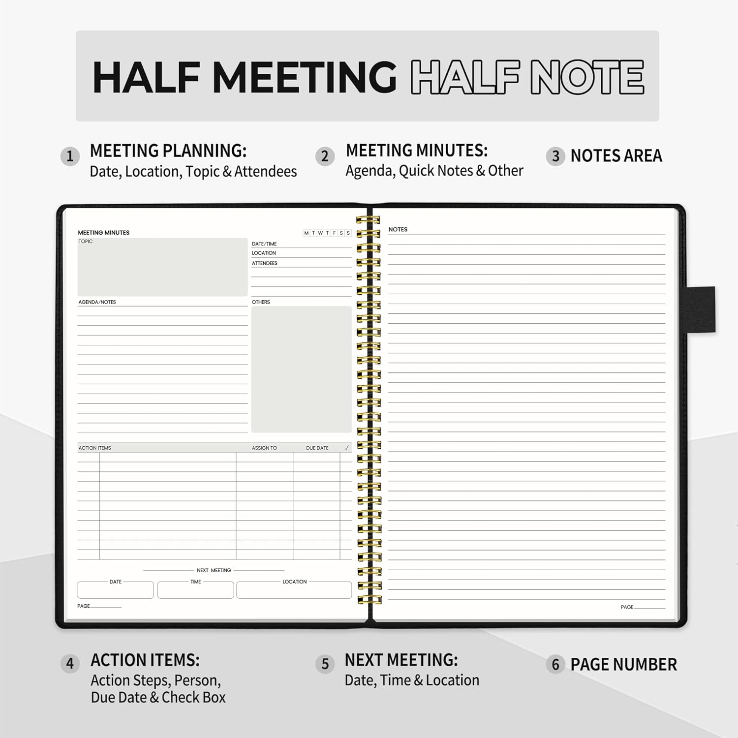 - Half Meeting Half Note: 1.MEETING PLANNING: Date, Location, Topic & Attendees 2.MEETING MINUTES: Agenda, Quick Notes & Other 3.NOTES AREA: Lined Page 4.ACTION ITEMS: Action Steps, Person, Due Date & Check Box 5.NEXT MEETING: Date, Time & Location 6.INDEX PAGE: Date, Title, Page Number, which will help create more effective meetings and good results.