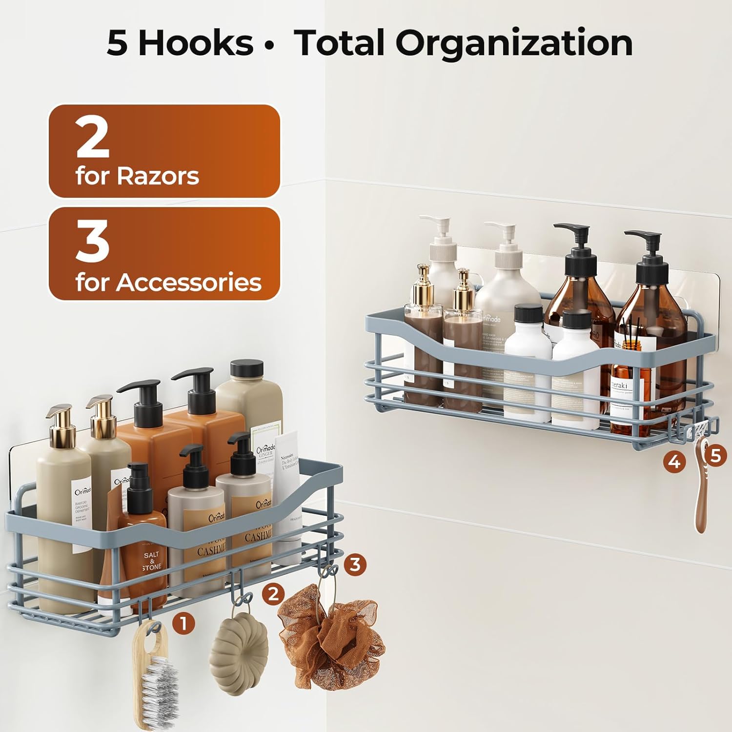 Orimade Shower Caddy Basket Shelf Storage Rack, No Drilling Wall Mounted Adhesive Rust Proof Stainless Steel Shower Organizer with 5 Hooks for Bathroom, Light Blue Grey 2 Pack