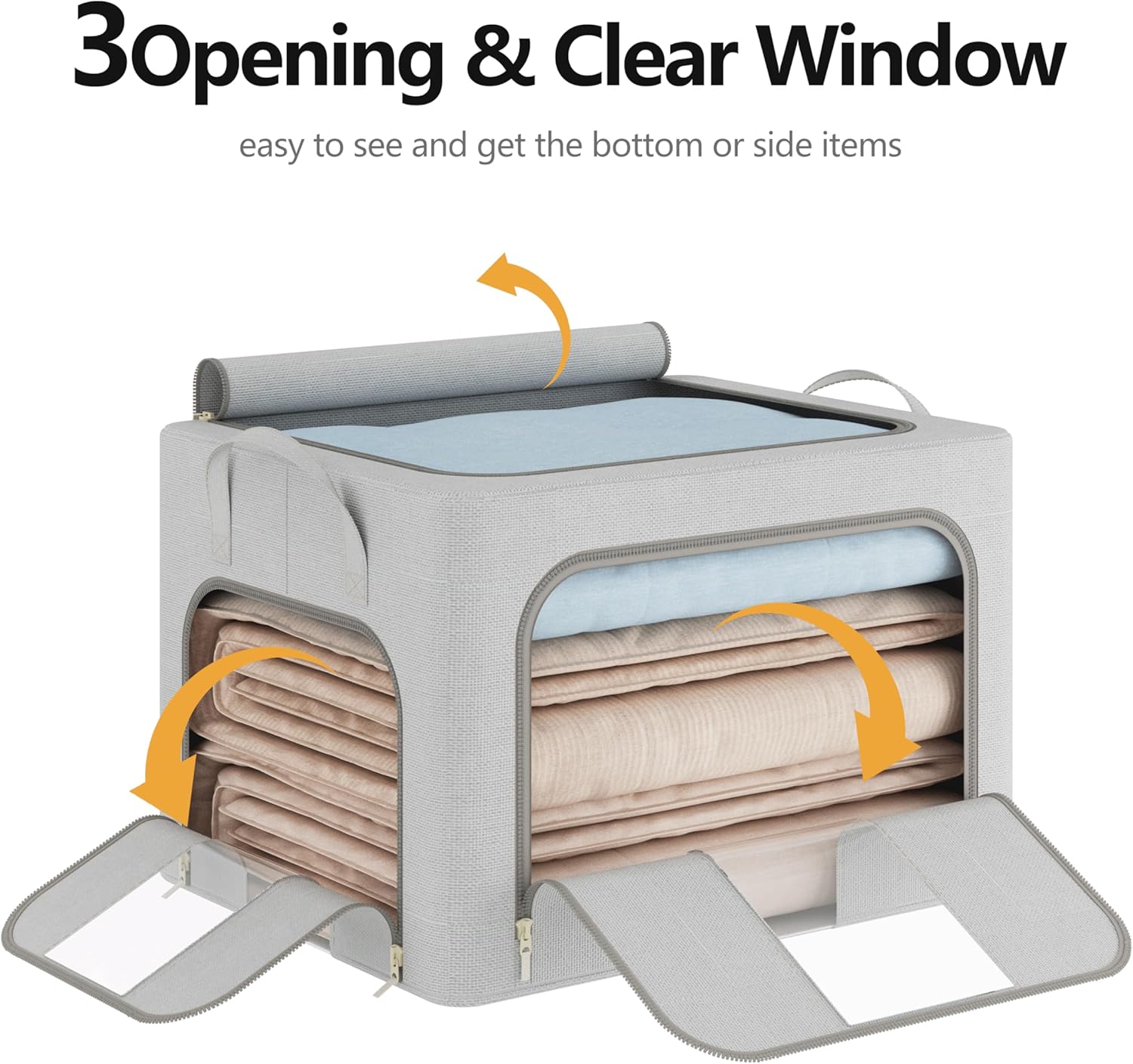 Pinkpum 3 Pack Clothes Storage Bins with Metal Frame, Closet Organizers and Storage Boxes, Stackable & Foldable Clothes Organizer Bags with Large Clear Window & Long Carry Handles, Grey 100L