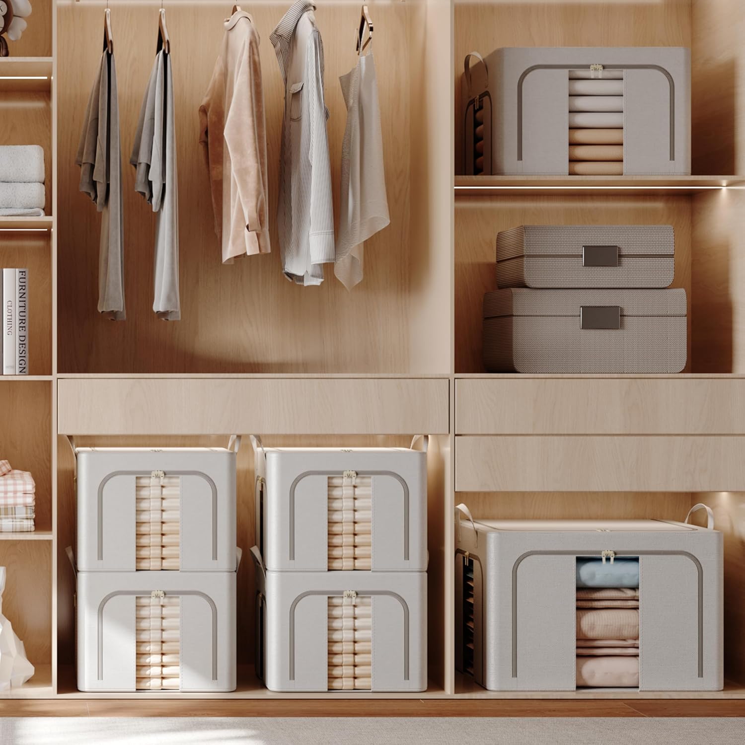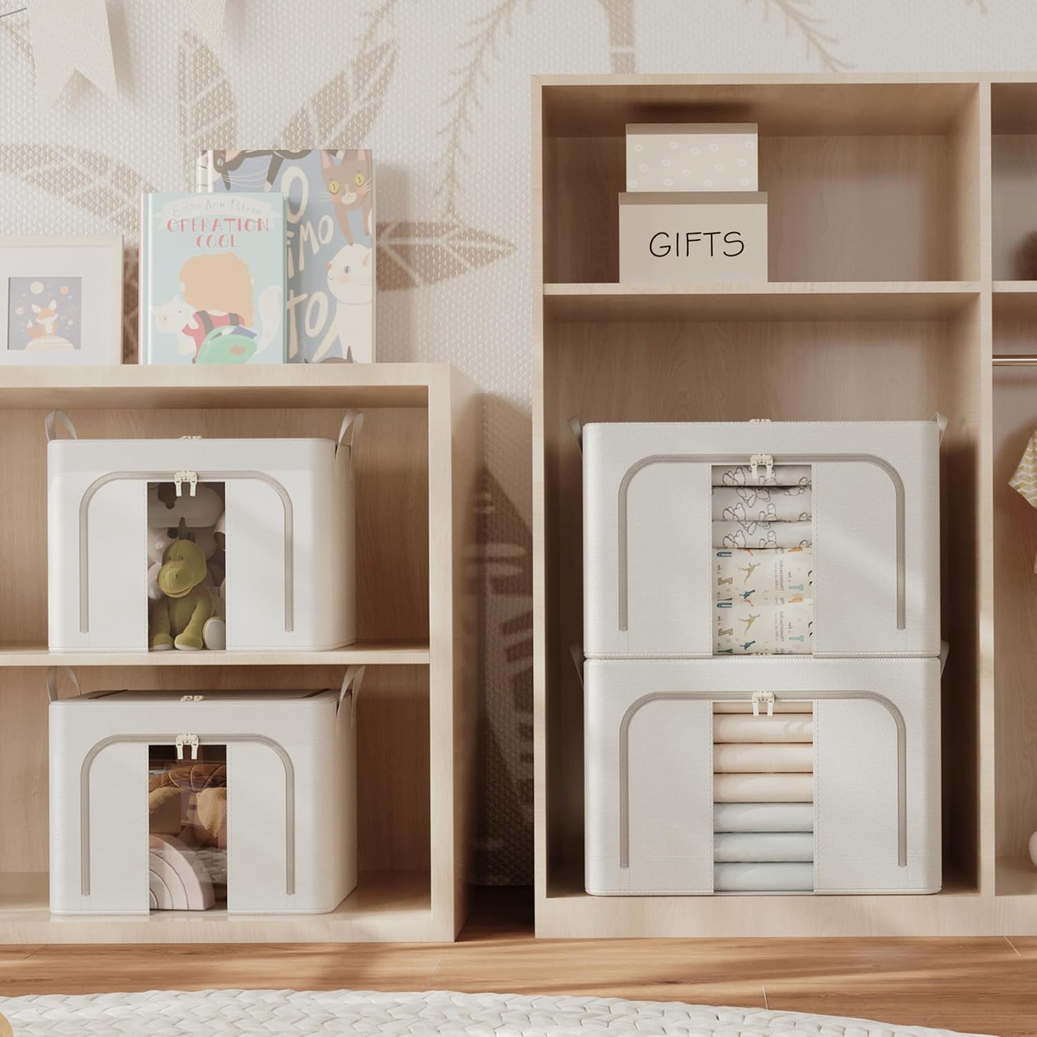 Pinkpum 3 Pack Clothes Storage Bins with Metal Frame, Closet Organizers and Storage Boxes, Stackable & Foldable Clothes Organizer Bags with Large Clear Window & Long Carry Handles, Beige 66L