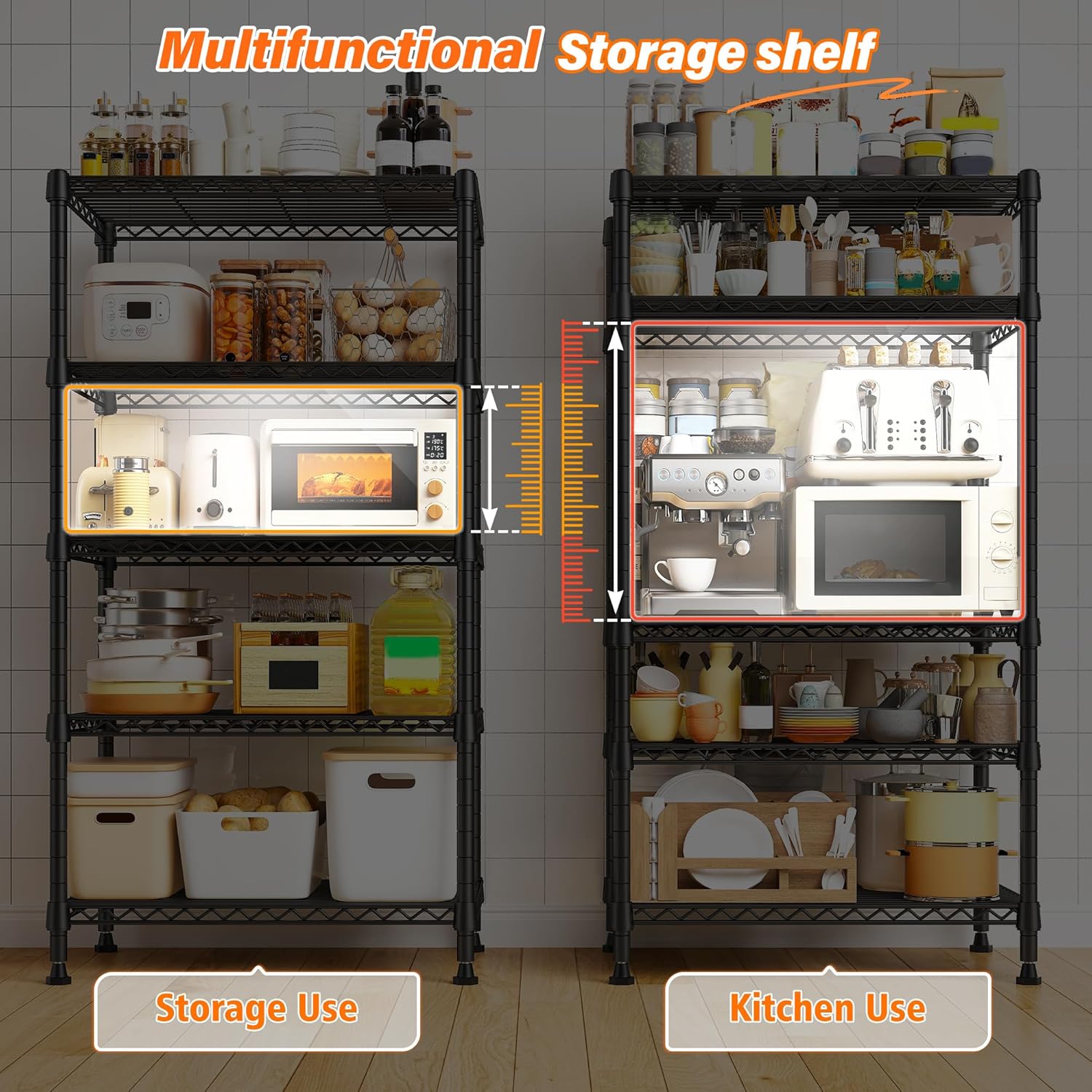 - 【5Tier Large Capacity shelving units and storage】This wire shelf has an large-capacity design with up to 5 tiers, significantly more layers,and this storage rack feature enhanced depth and width. Each individual shelf can load a substantial weight up to 90 pounds, culminating in a maximum overall load-bearing capacity of 450 pounds.Such a design enables you to efficiently store and accommodate a larger variety of items, catering to your diverse storage needs.