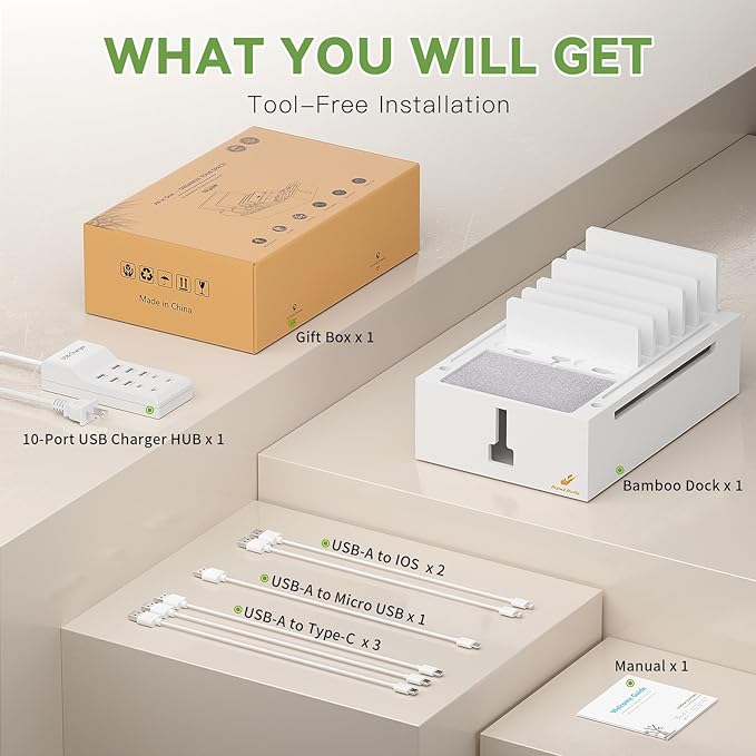 - What You Can Get: 1 x Pezin & Hulin Bamboo Charging Station, 1 x 10-Port USB Charger HUB & Cord, 6 x Short USB Cables (3pc Type-C, 2pc for lPhone & lPad, 1pc Android) for your daily use, 1 x user manual