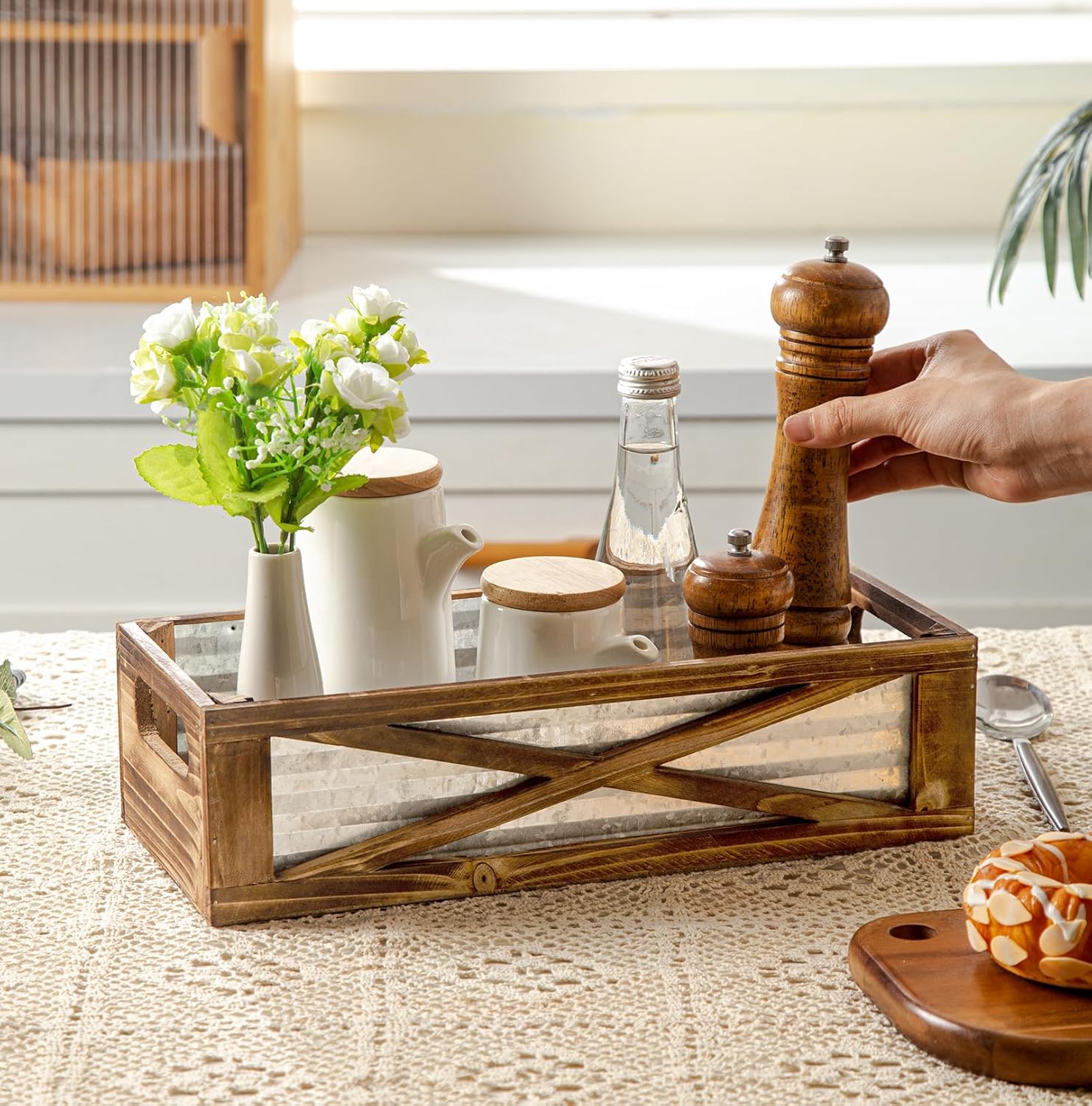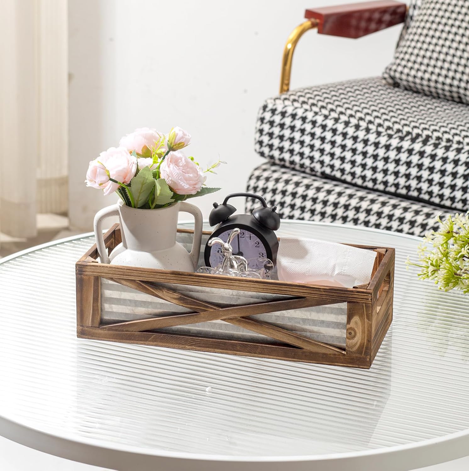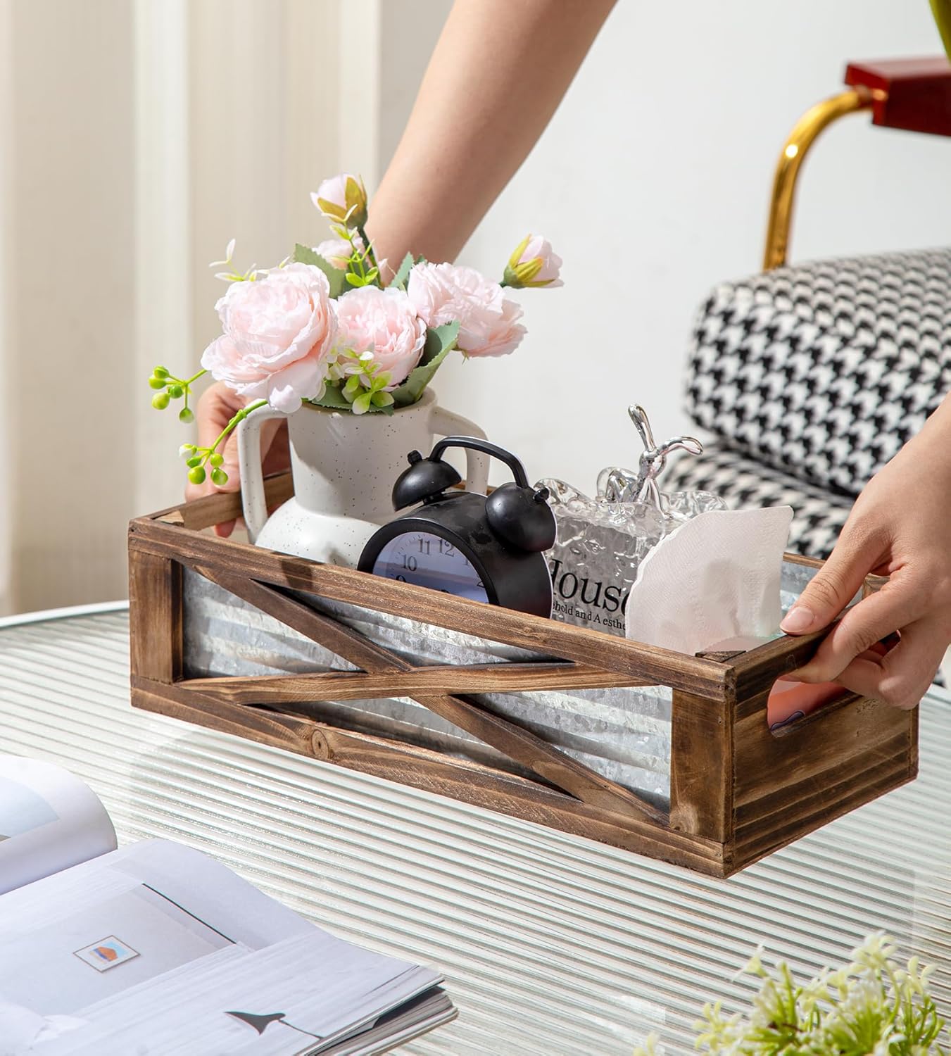 - STURDY CONSTRUCTION - Crafted from high-quality solid wood and galvanized sheet, this farmhouse decorative box is sturdy and durable for long-term use. It comes with a removable plastic clear liner for easy cleaning and water resistant. The bottom has 4 non-slip pads to prevent scratches the countertop.
