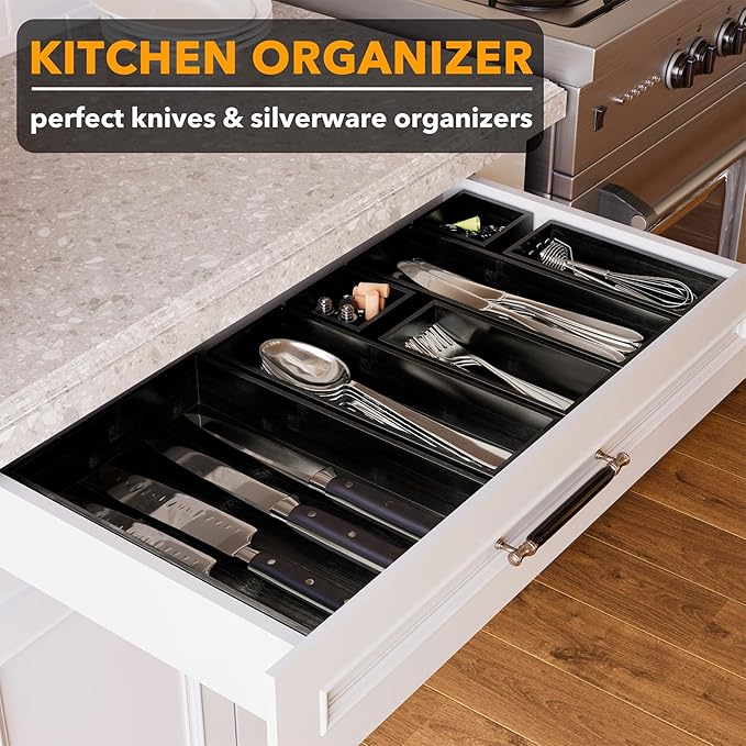 - KITCHEN UTENSILS STORAGE - Designed to hold silverware, utensil, flatware, cutlery, spoons and knives; The bamboo organizer for kitchen storage organization is 1.9" High; MEASURE YOUR DRAWER HEIGHT FIRST