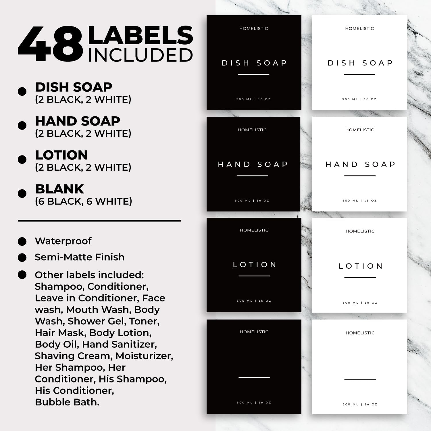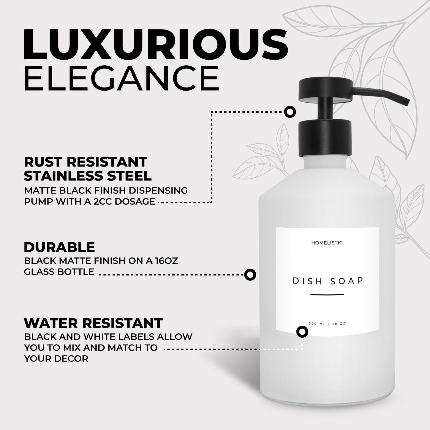 - Elegant Design. This luxury glass soap dispenser set features elegant White bottles with matte black pumps, perfect as a dish and hand soap dispenser set that seamlessly fits into any modern home decor.