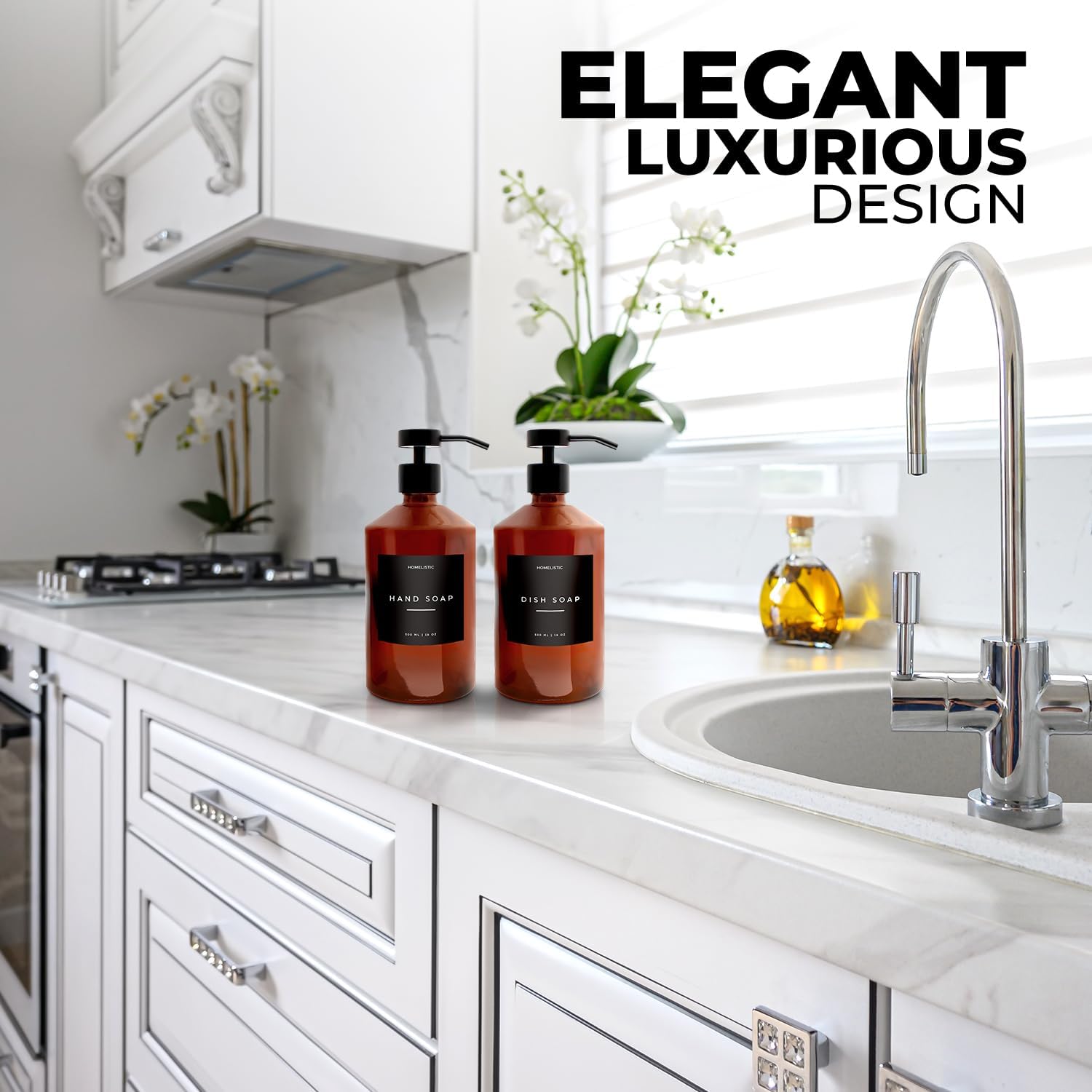 - **Elegant Design**: This luxury glass soap dispenser set features elegant amber glass bottles with matte black pumps, perfect as a dish and hand soap dispenser set that seamlessly fits into any modern home decor.