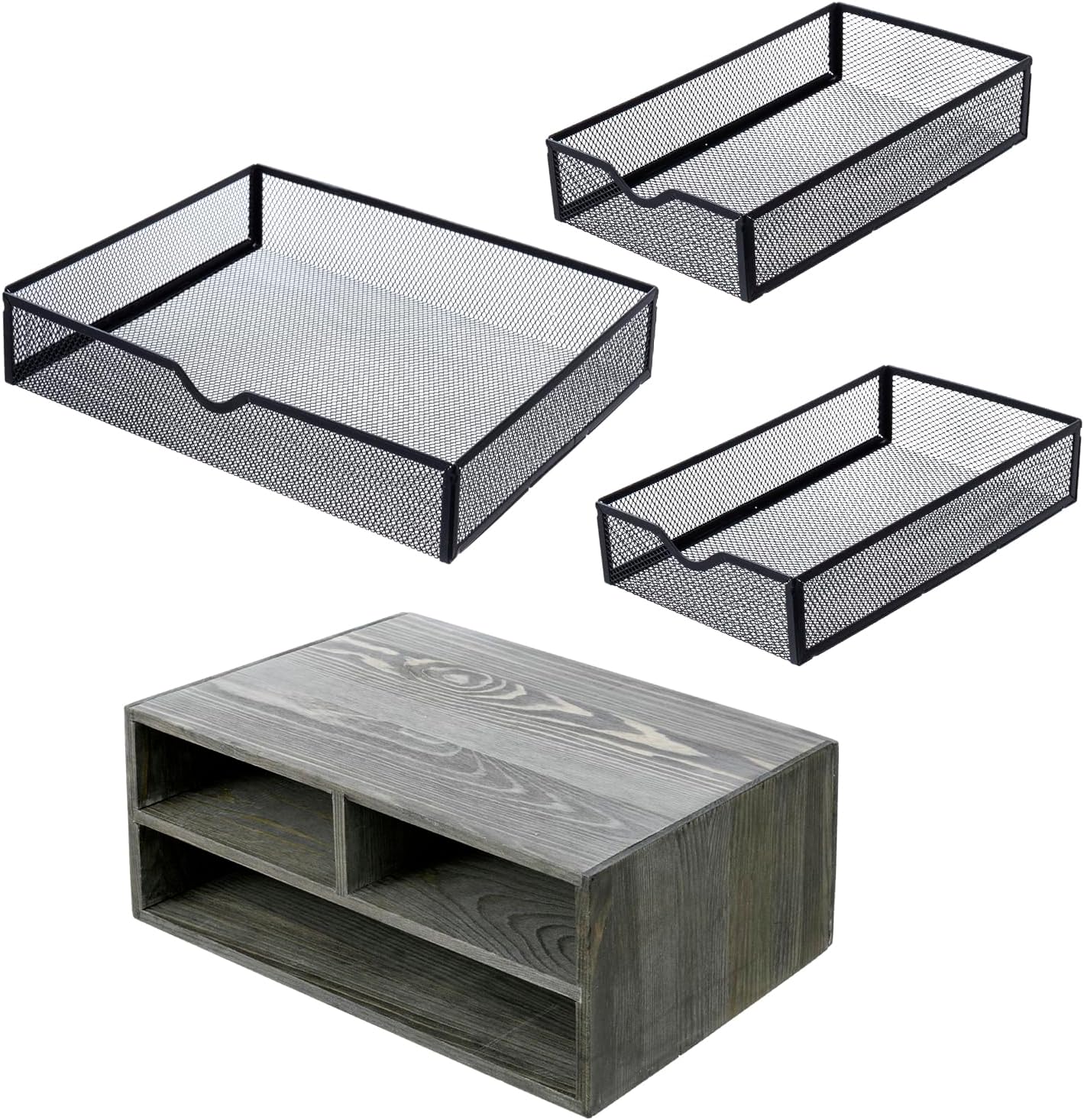 MyGift Vintage Weathered Gray Solid Wood Desktop Organizer Box with 3 Removable Black Metal Mesh Trays, Office Desk Supplies Storage Drawers for Accessories