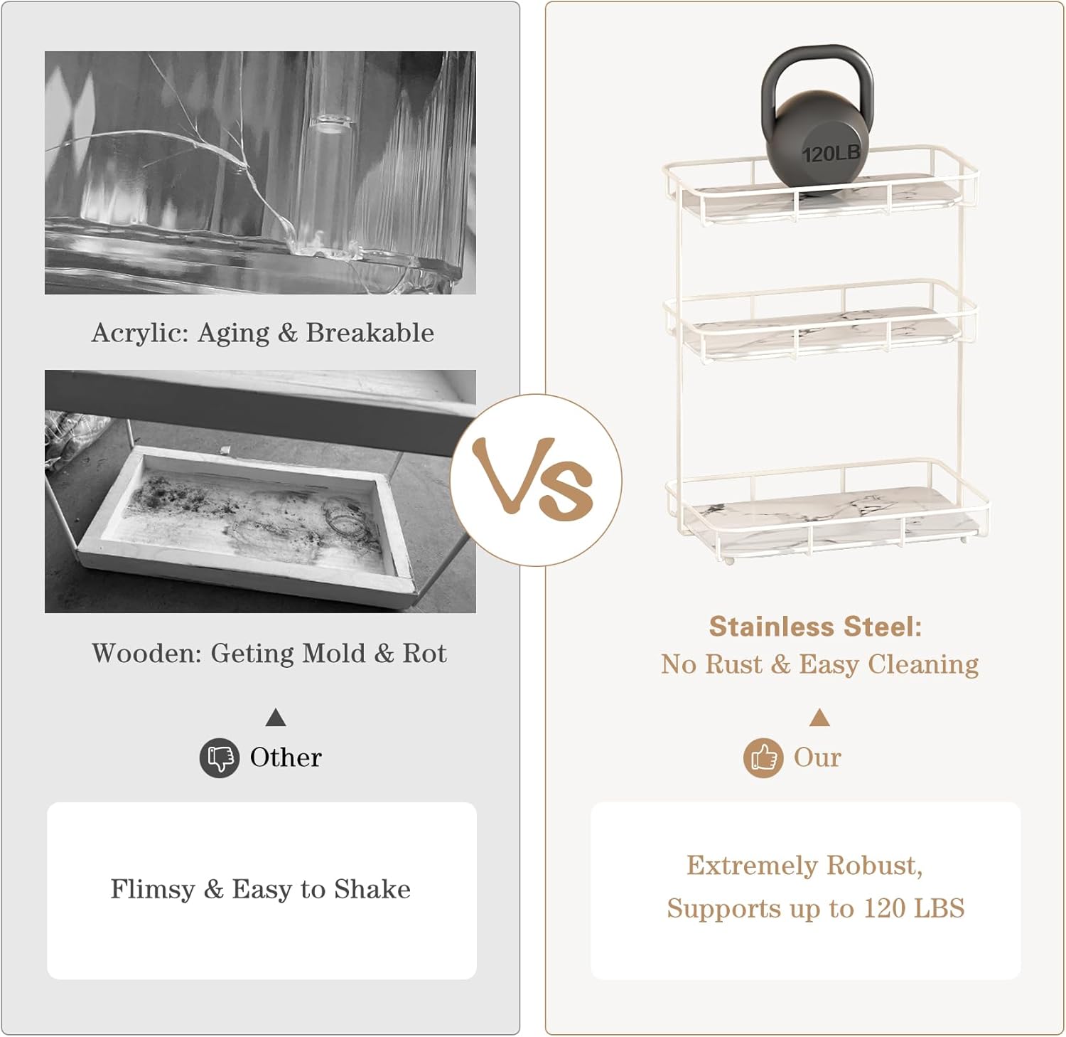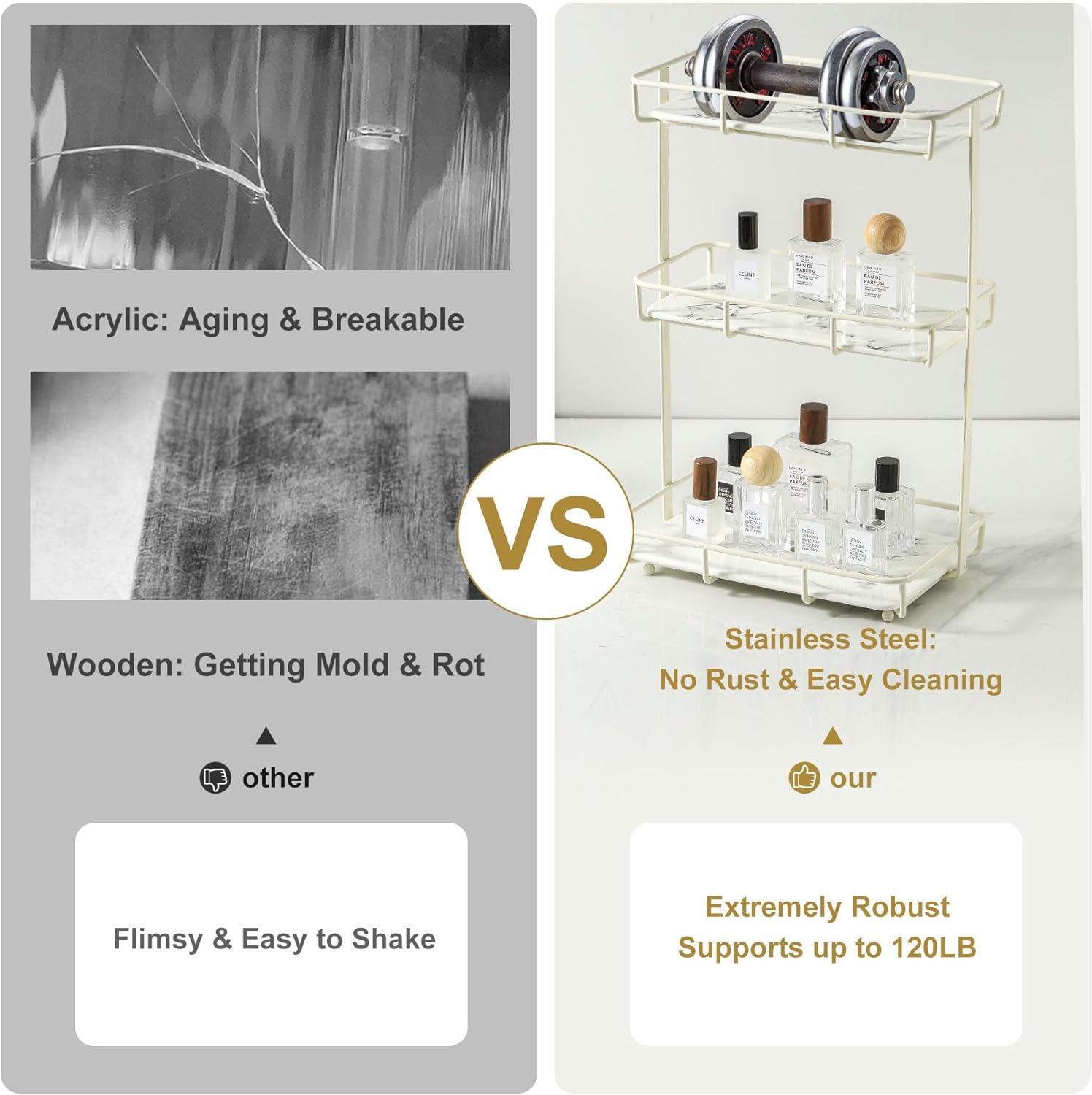 - EASY TO CLEAN: With a sturdy stainless steel frame that can prevent corrosion in wet places and removable ceramic trays with a luxurious marble pattern, this dresser top stand is both functional and easy to clean.
