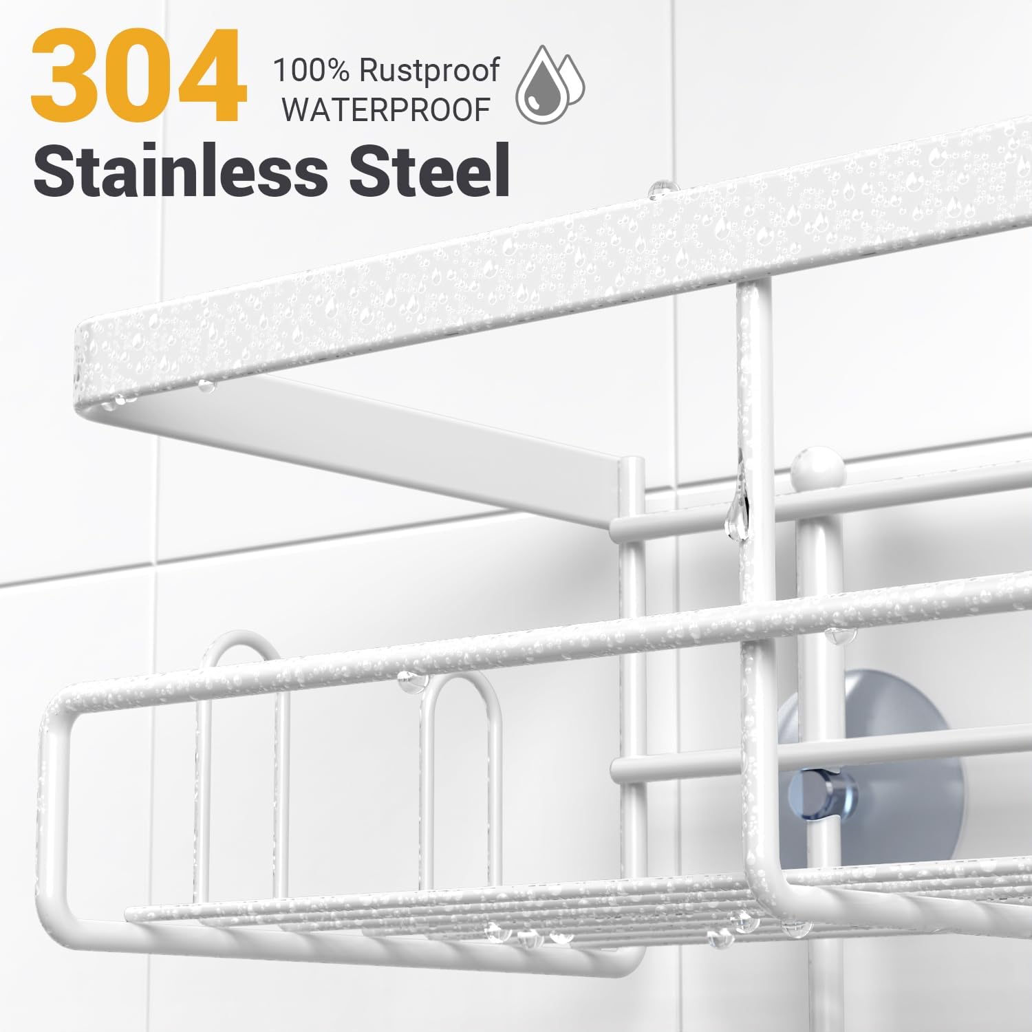 - Easy Installation with No Drilling: To install our bathroom storage shelf, no drill and no hardware. You just need to insert the lower part into the upper pipe of the shower rack, then screw on the screws, hang two baskets, place the shower shelf above the shower, then fix the suctions, and you are done, you can enjoy your cozy bathroom relaxation time.