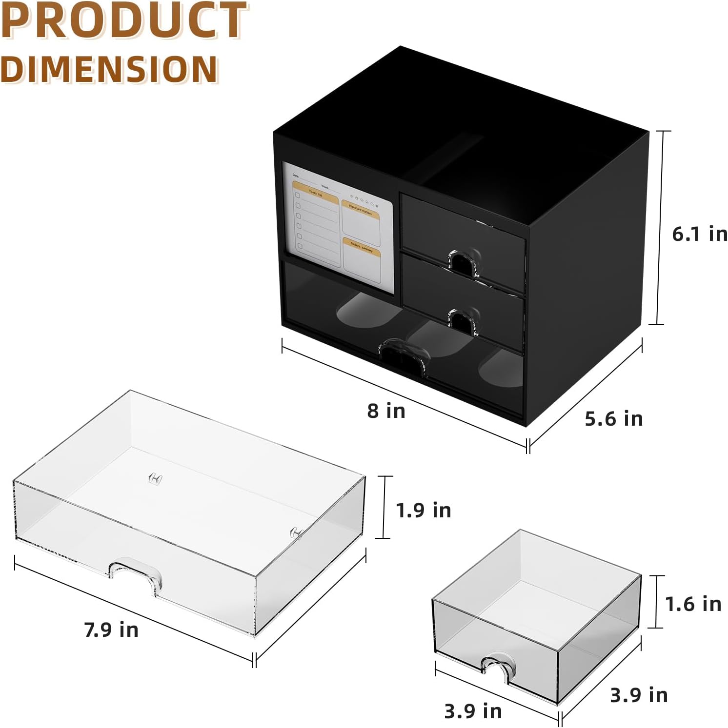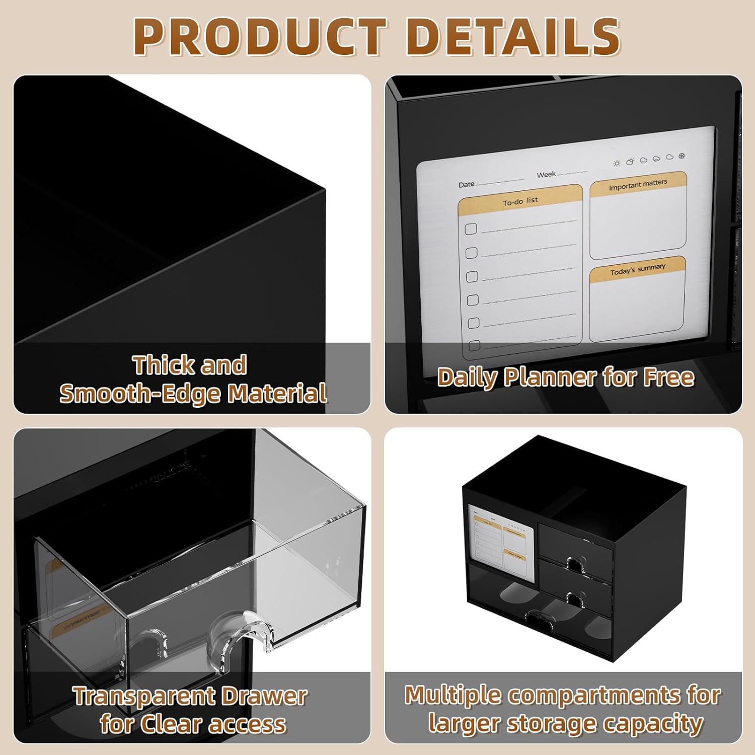 Marbrasse Desk Organizer with 3 Drawer, Multi-Functional Pencil Pen Holder for Desk, Desk Organizers and Accessories with 4 Compartments, Desktop Organizer Storage for Office Home Art Supplies (Black)