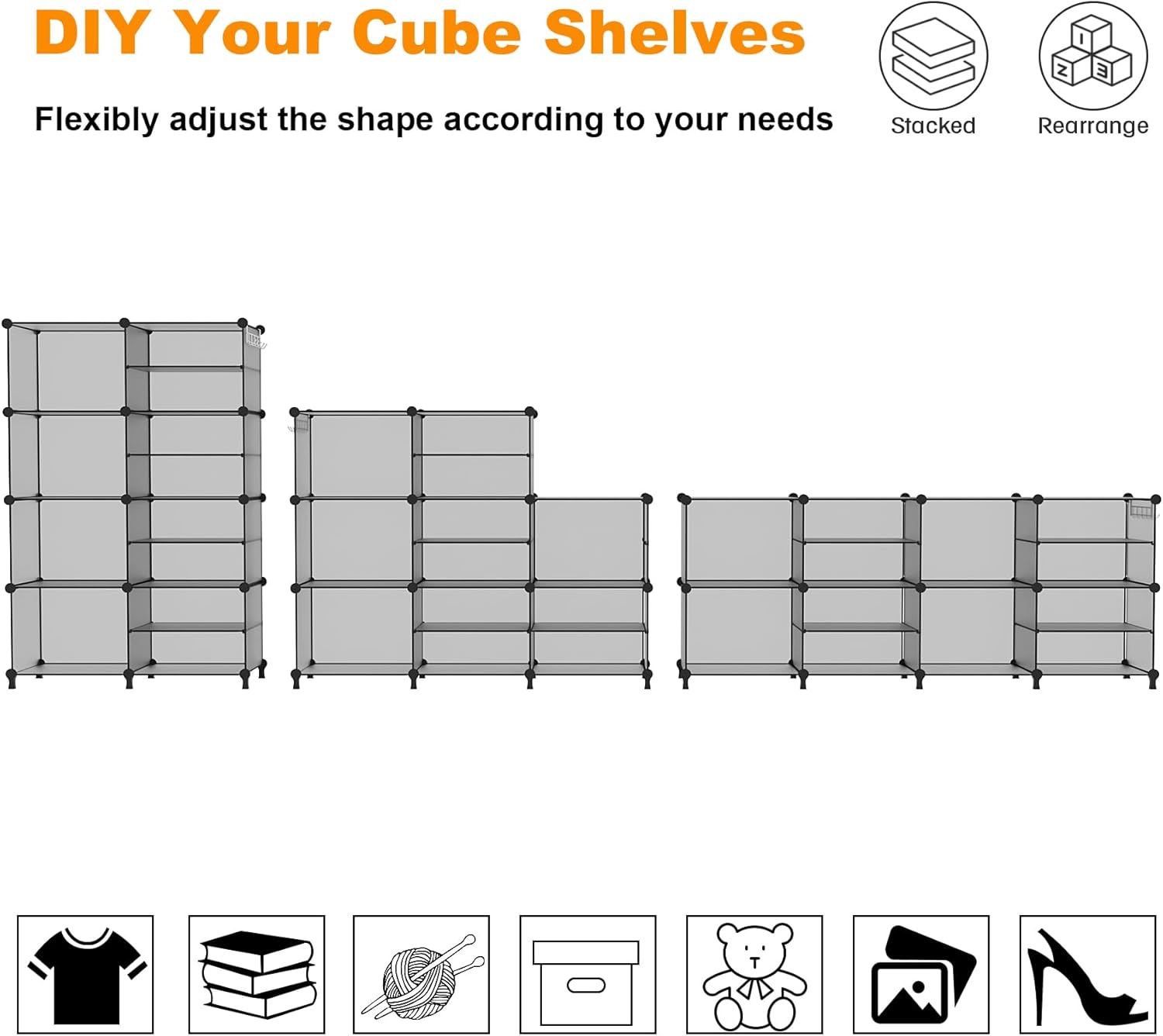 - Multi-use Storage: 8 cube closet Organizer storage shelf provide adequate space to organize and free up closet space, you can configure them to fit in your closet, bedroom, kids room, office; works well to organize clothes, toys, books, bins, bag, shoes, craftwork, yarn, pillows. Great way to keep things organized