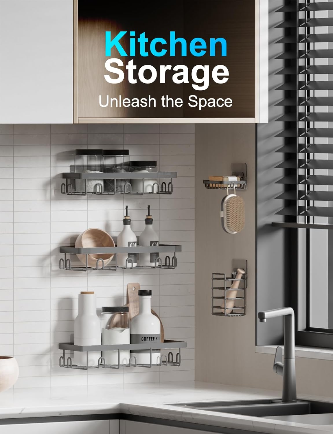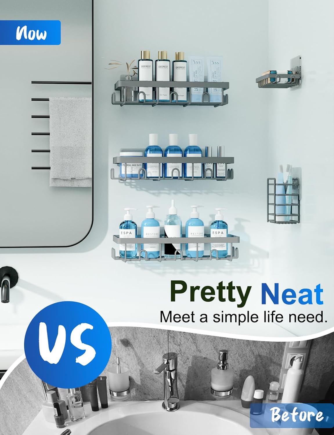 - 5 Must-Have Bathroom Organizers and Storage: Our shower organizer set includes 3 shower caddies, 1 soap rack, 1 toothbrush shelf, and 5 adhesive hooks, providing more storage space than ever before. The shower shelves set is designed with over 11 sturdy metal hooks for bath towels or sponges. It's not only perfect for organizing bath supplies but also for storing other essentials. These compact and versatile shelves can meet all your storage needs, fitting well in the bathroom, washroom, kitchen, RV, bedroom, living room, laundry room, and tool room.