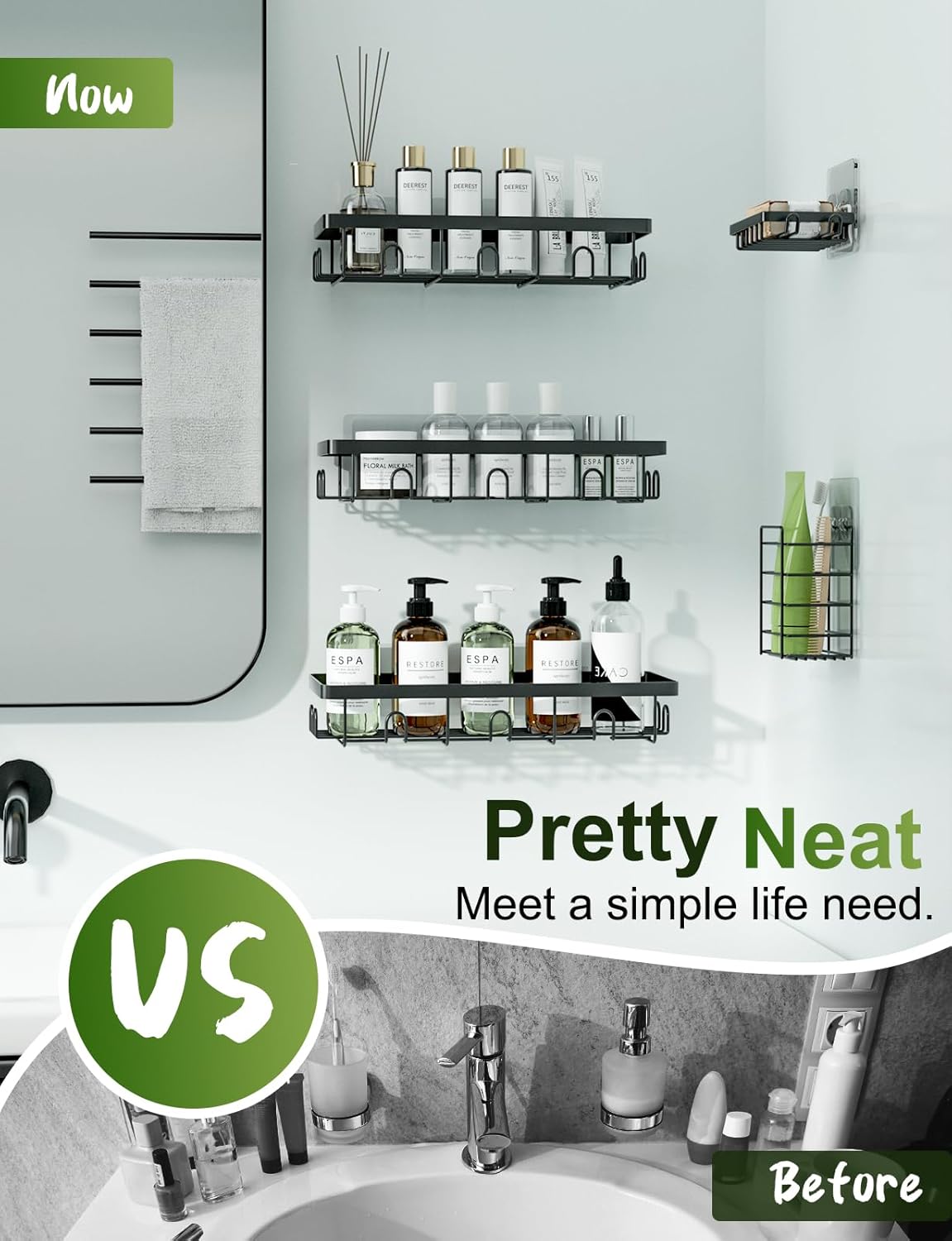 - High-End Classic Home Decor: Our high-end classic shower organizer set is more than just a storage shelf - it saves space and adds beauty to your home, making it ideal and essential for the bathroom, study, kitchen cabinet, or closet. It can hold items well, such as toys, books, paint bottles, tools, or pet snacks, and is suitable for most walls made of marble, tile, tempered glass, or wood.
