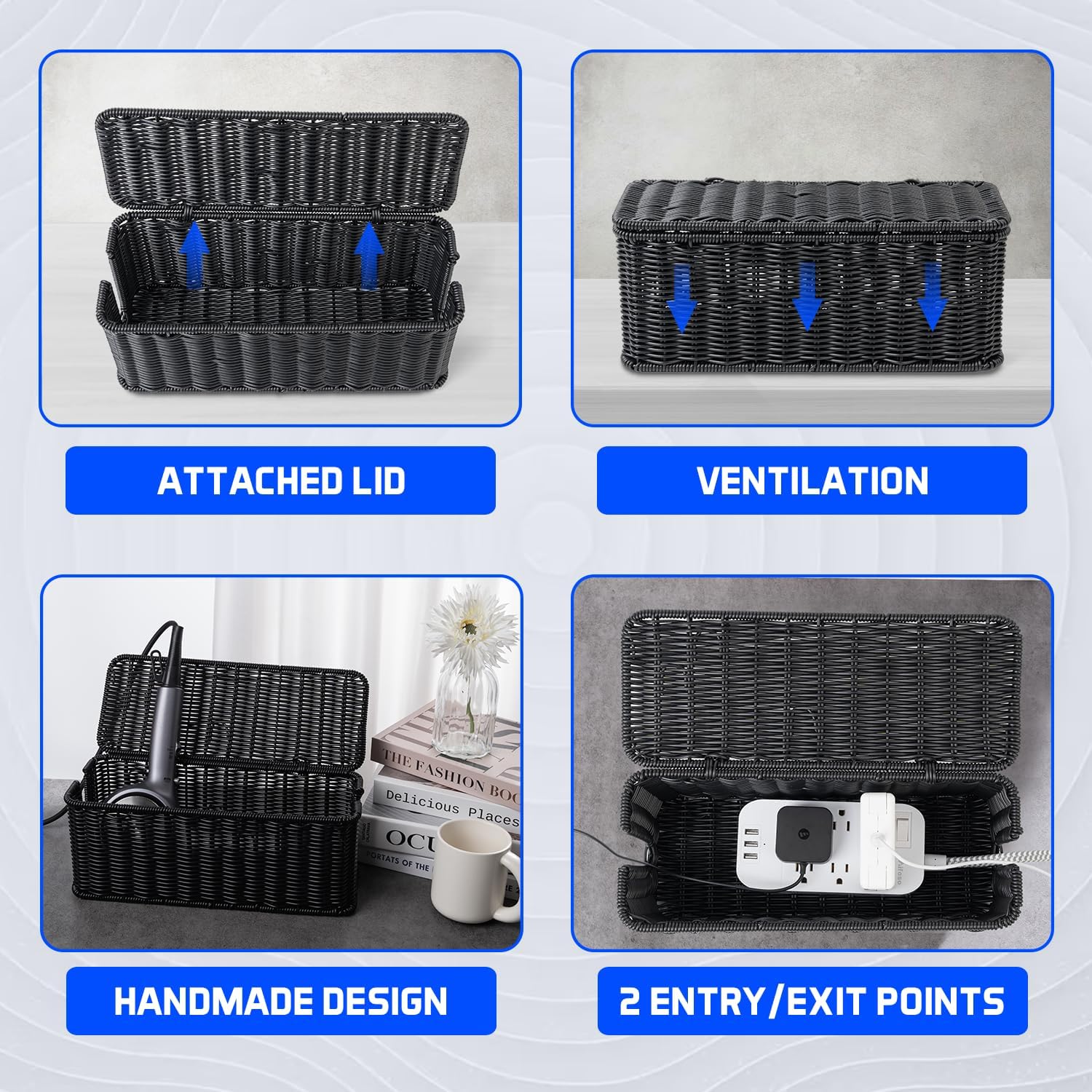 - Elegant & Safe Handwoven Synthetic Rattan: Our Cantalop Cord storage organizer with attached lid boasts a handmade polypropylene rattan like plastic, adding a touch of rustic elegance to any room. This cable organizer is carefully designed to hide wires and improve your space with a charming touch.