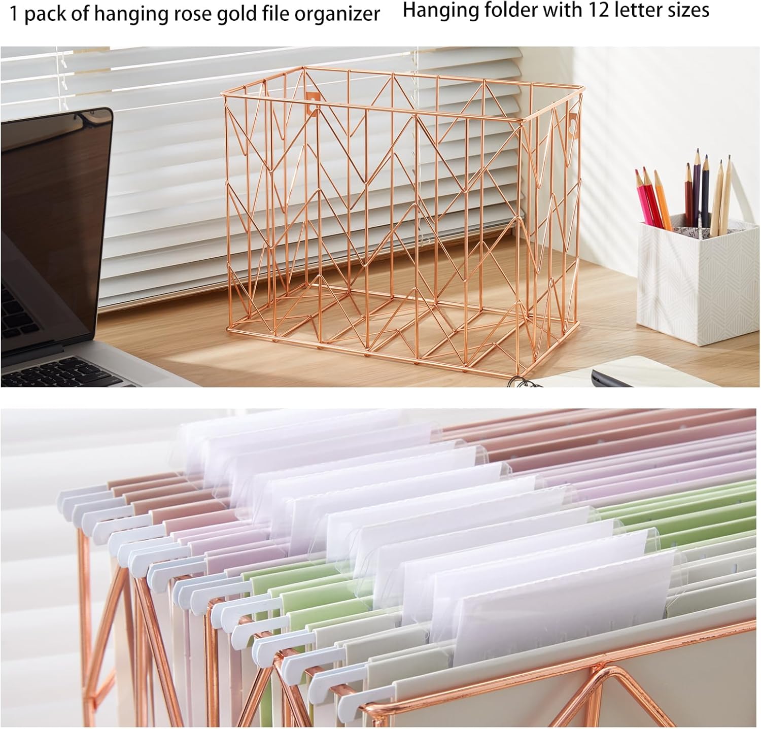 Hanging rose gold file organizer with 12 letter sized hanging folders, file basket, file box, storage box, office and school supplies