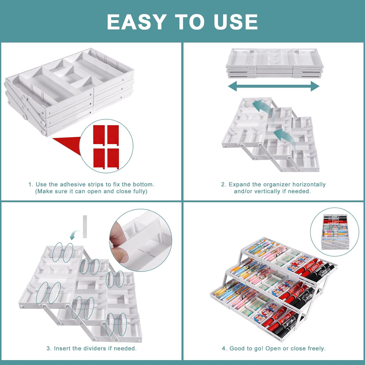 - Versatile & Expandable Neat Storage: Perfect for cosmetics, jewelry, office supplies, crafting and sewing supplies, miscellaneous, odds and ends, toiletries, stationery, tools, batteries, flatware, and kitchen utensils with a collapsible 2-tier or 3-tier design and adjustable dividers.