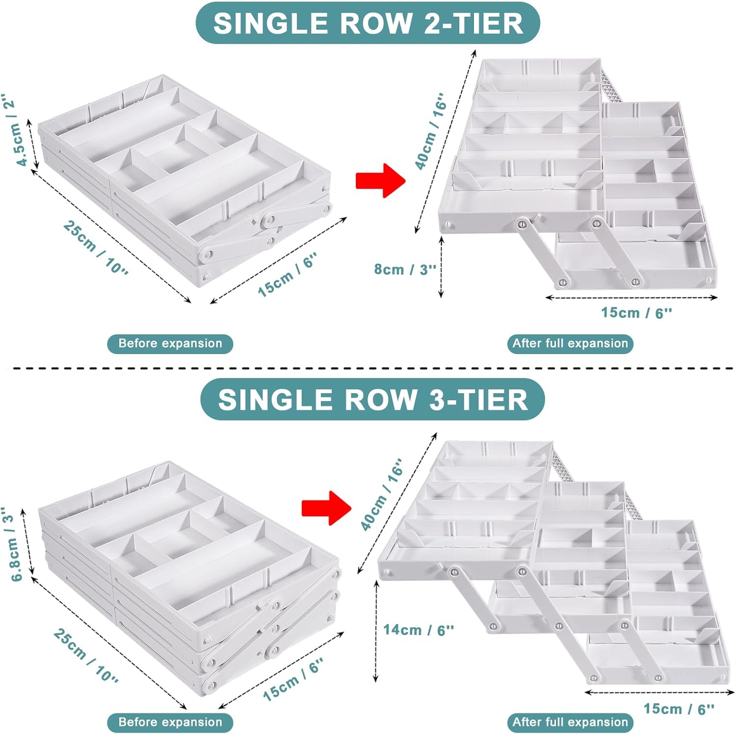 - Fodable Compact Size: These versatile options are perfect for any drawer. Designed to fit seamlessly into most standard drawers, providing an organized solution without compromising space. Single-row 2-tier: 10'' x 6'' x 2''; expands to 16'' x 6'' x 3''. Single-row 3-tier: 10'' x 6'' x 3''; expands to 16'' x 6'' x 6''. Double-row 2-tier: 12'' x 10'' x 2''; expands to 20'' x 16'' x 3''. Double-row 3-tier: 12'' x 10'' x 2.6''; expands to 28'' x 16'' x 6''.