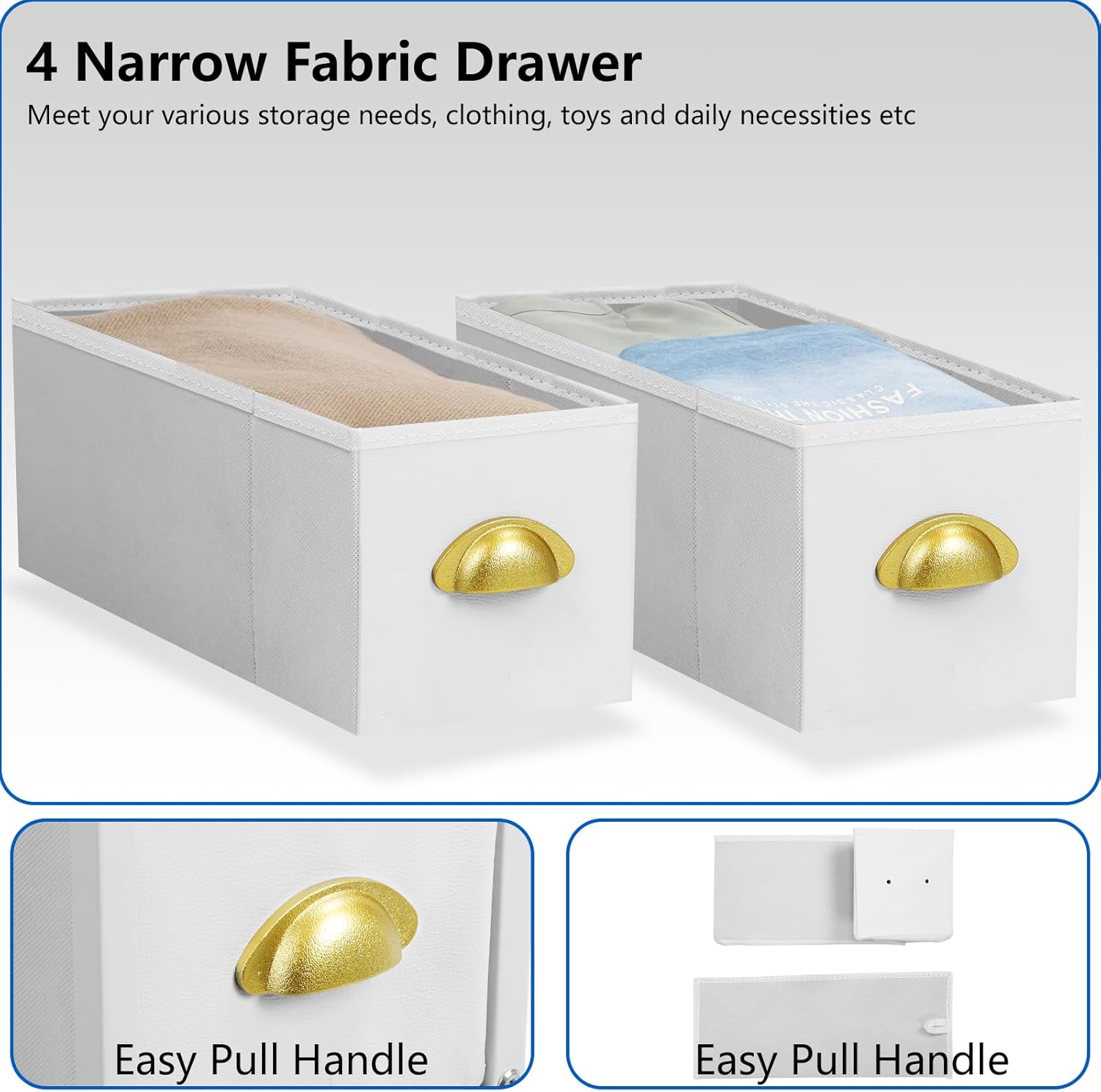 - MULTIFUNCTION DRESSER: The chest of drawers contains 4 removable and foldable drawers, providing multiple storage options and plenty of space. You will need such a narrow dresser or bedside table to store clothes, scarves, socks, toiletries, makeup tools, cosmetics, office supplies, toys and more.