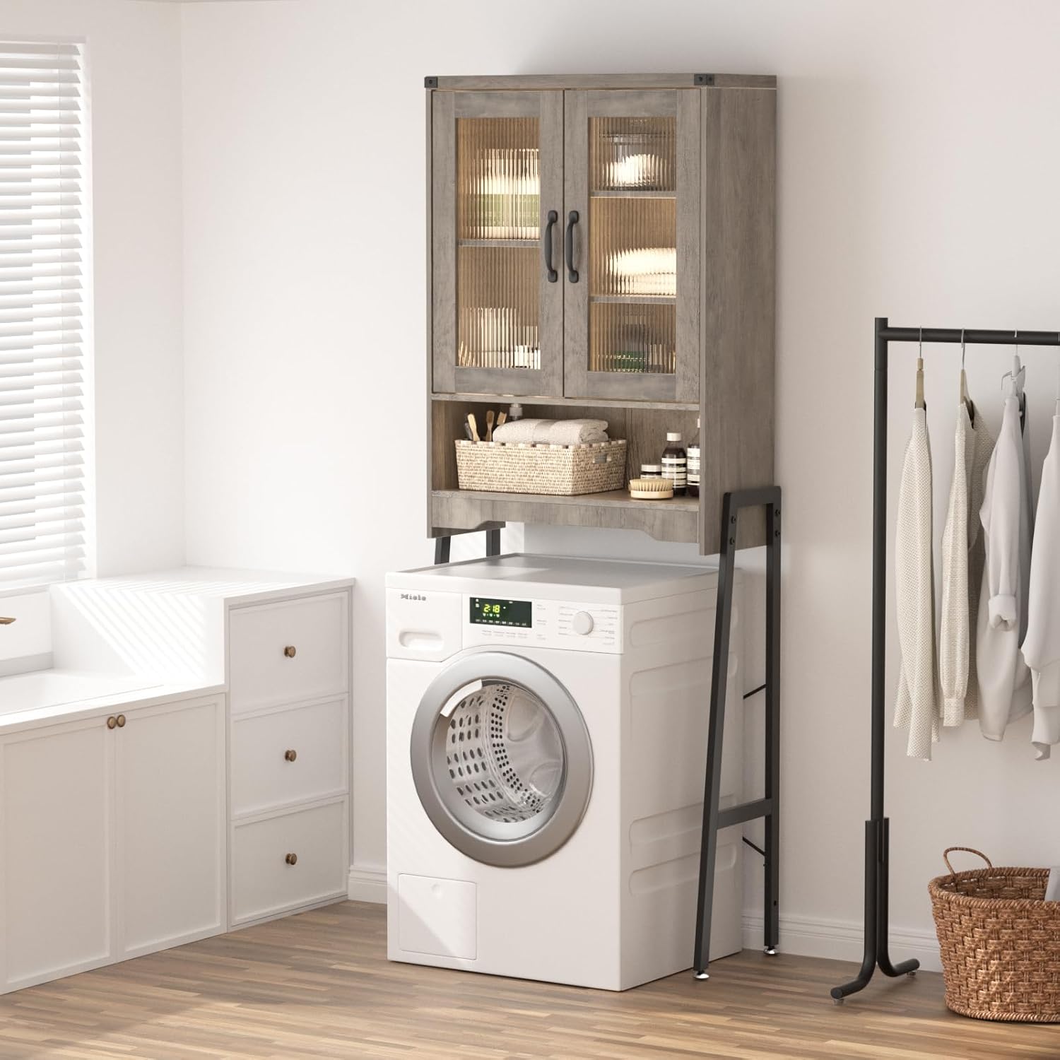 - Elegant Appearance: Our stylish toilet storage combines a wooden cabinet with a metal rack. The Light luxury grey cabinet, along with translucent glass doors, creating a chic modern aesthetic and chic elegant for your bathroom, making it a standout piece in your home decor