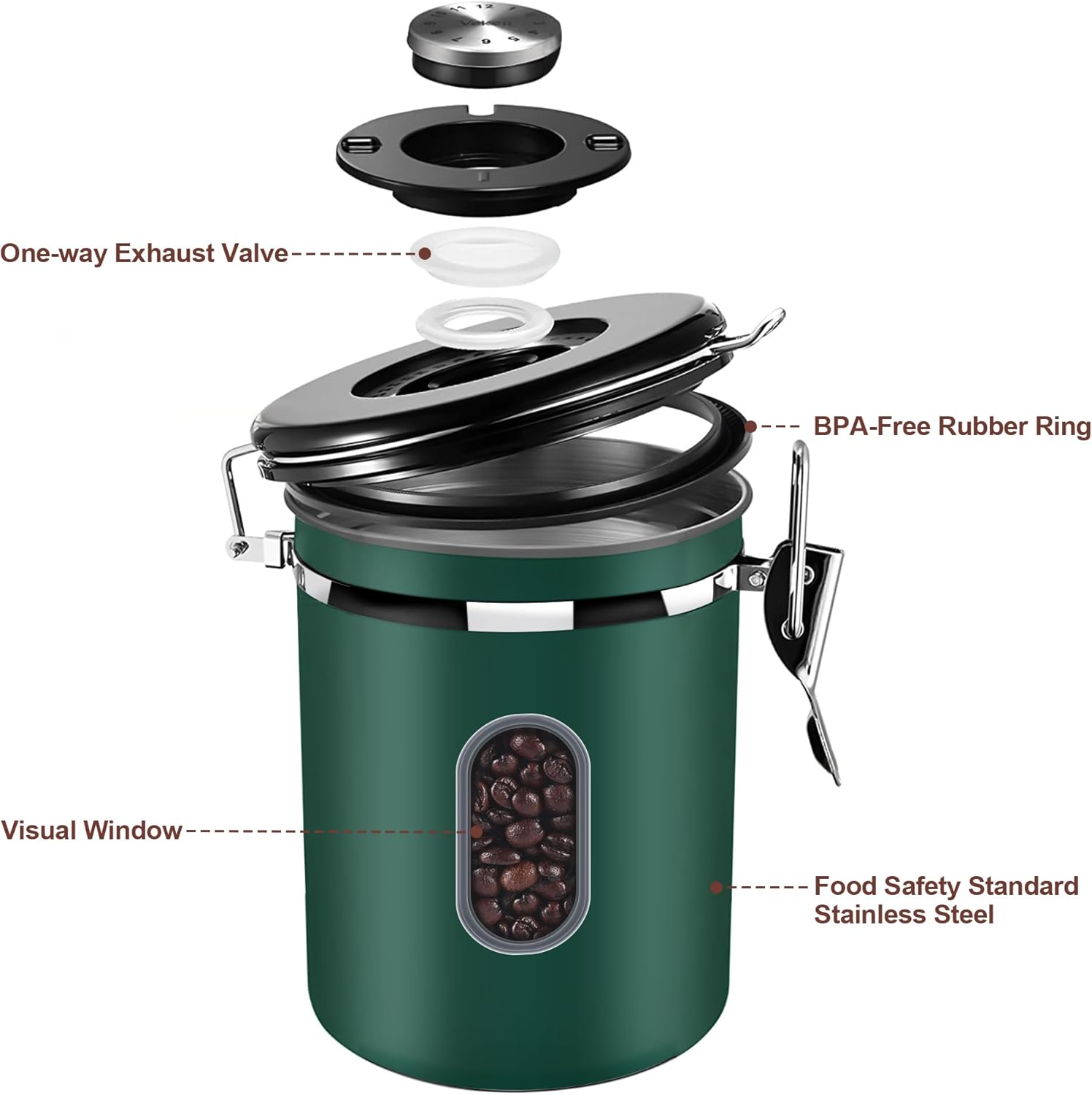 ROCKY&CHAO Airtight Coffee Canister with Date Tracker & Transparent Window, 22OZ Large Tea Coffee Canisters, Coffee Storage Canister, Coffee Container with 30ml Measure Spoon and 4 Co2 Valve(Green)